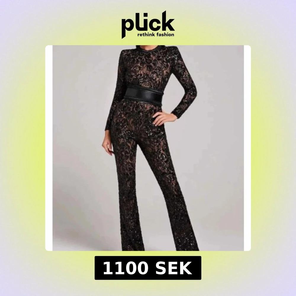 Säljer en svart jumpsuit med långa ärmar, täckt av glittriga paljetter och spetsdetaljer. Den har markerade axlar och ett brett svart bälte i midjan som ger en snygg siluett. Den är uppsydd i benen inifrån (så man kan sprätta upp till den orginala benlängden) benen just nu passar mig som är 158 cm med ett par klackar