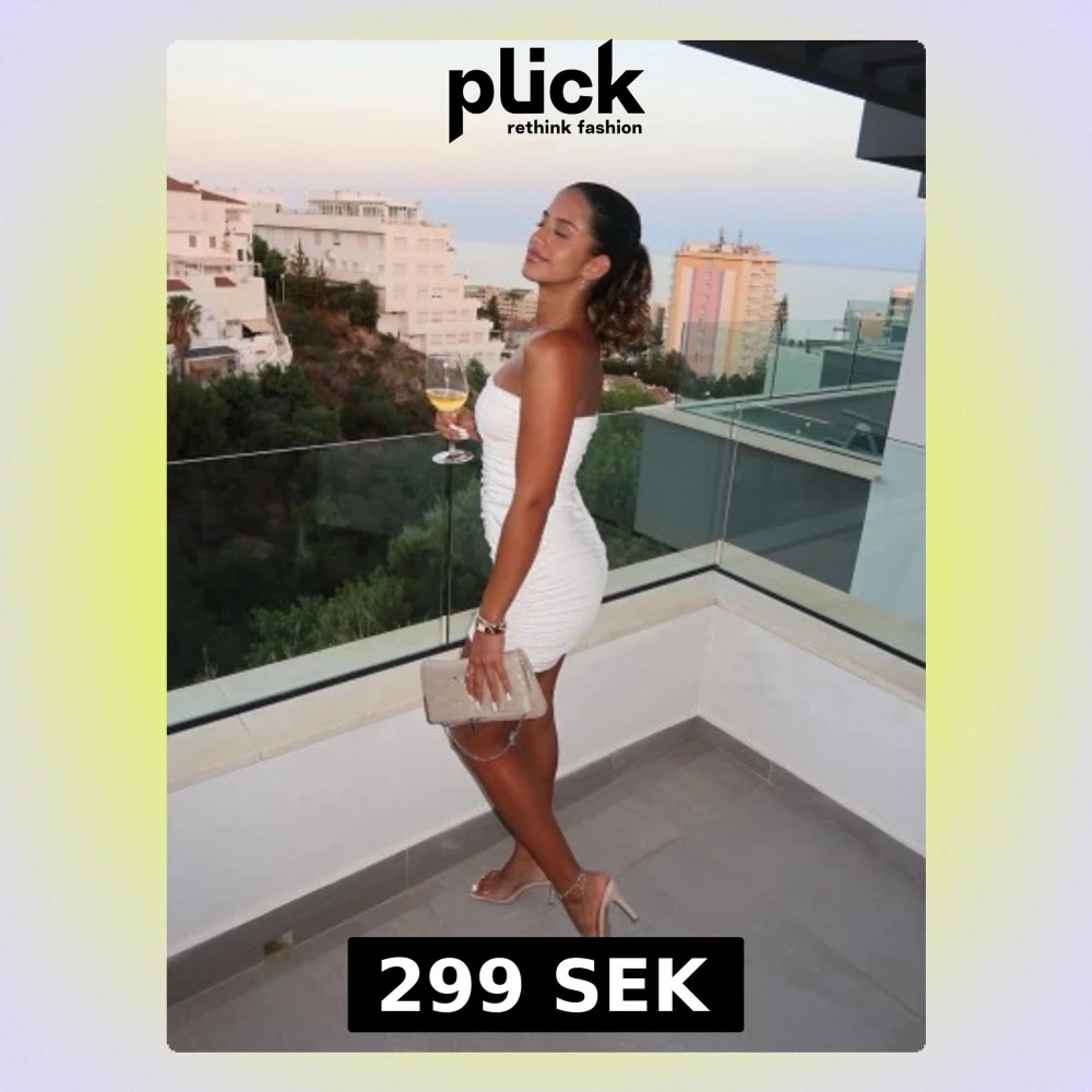 Snygg vit axelbandslös kort stretchig klänning med figurnära passform och rynkade detaljer i sidorna.Klänningen har en enkel design och är lätt att matcha med accessoarer.