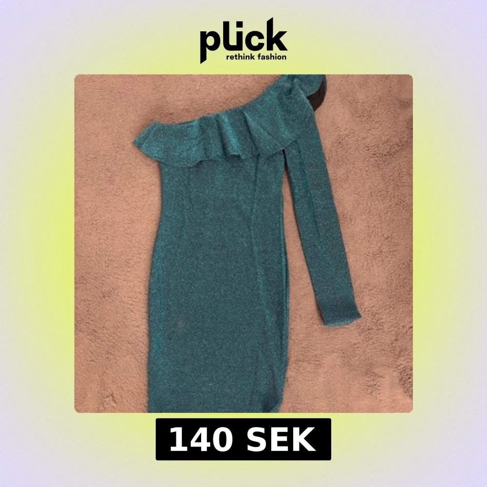 Snygg glittrig grön kortklänning från Nelly i storlek XS. Klänningen har en one shoulder-design med volang upptill och lång ärm på ena sidan. Använd vid endast två tillfällen😊🌸