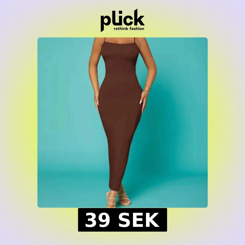 Snygg brun långklänning med smala axelband och figurnära passform. Klänningen har öppen rygg med korsade band och är ärmlös. Perfekt för dig som gillar en stilren och trendig look.
