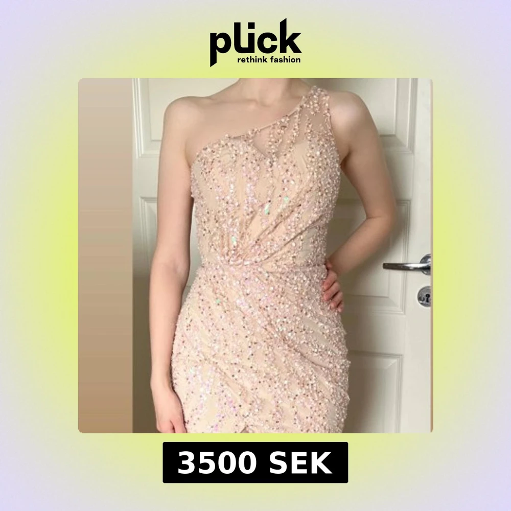 Superfin långklänning från Jadore i champagnefärg med glittriga paljetter över hela klänningen. One shoulder-modell med slits framtill och figurnära passform. Perfekt för bal eller fest, ger en lyxig och elegant känsla. Helt ny och oanvänd!