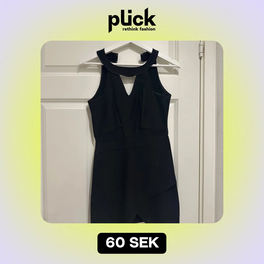Elegant svart klänning med v-ringning och asymmetrisk design. Den är ärmlös och har en stilren look som passar perfekt för festliga tillfällen.