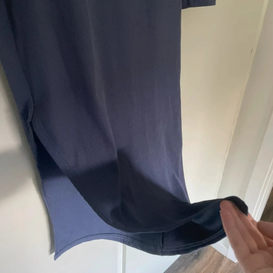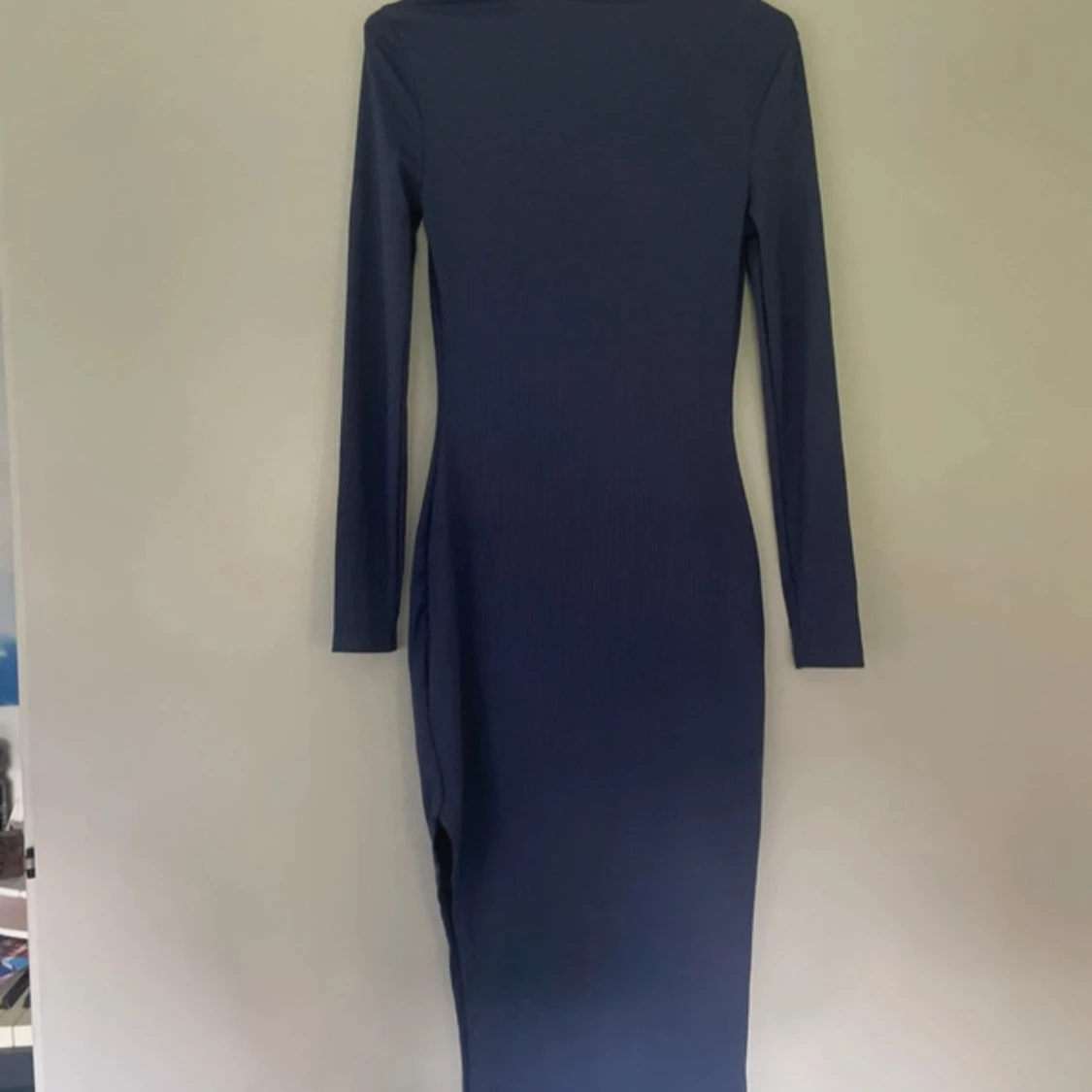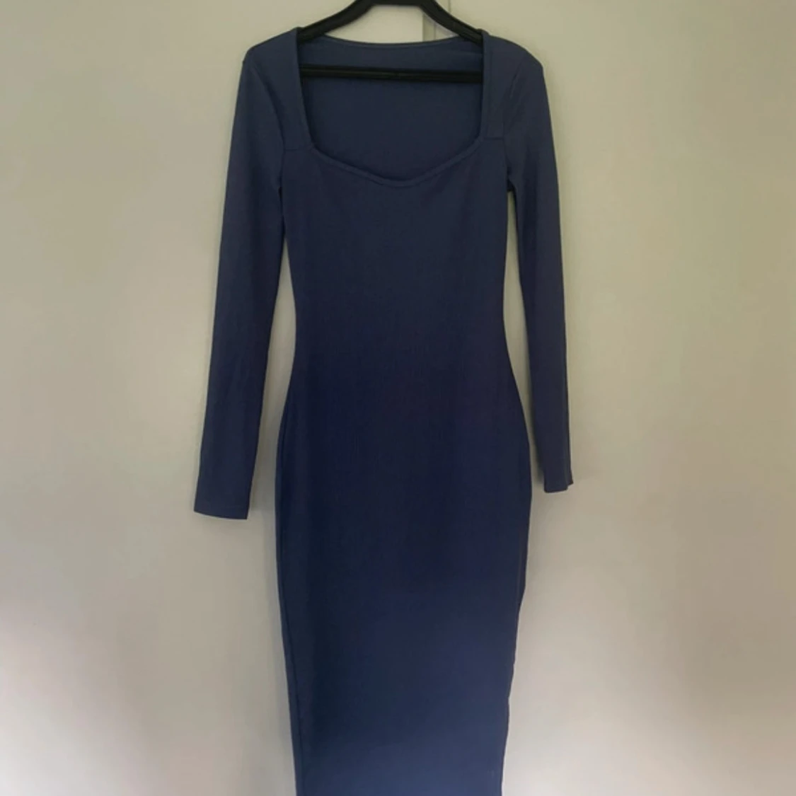 Snygg marinblå långklänning med ribbad struktur och långärmad design. Klänningen har en fyrkantig urringning och är figurnära med stretchigt material som sitter skönt mot kroppen. Perfekt för dig som gillar stilrena och enkla plagg med modern touch.