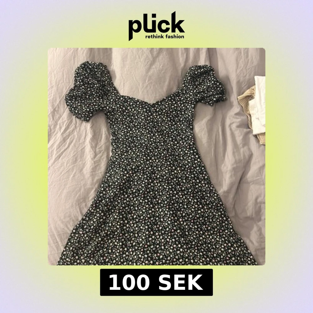 Supersöt svart kortklänning med små blommor i vitt, rosa och grönt från H&M Divided. Klänningen har puffiga kortärmar och en smickrande v-ringad hals. Perfekt för dig som gillar romantisk och trendig stil. Materialet är mjukt och lätt, troligtvis bomull eller polyester.