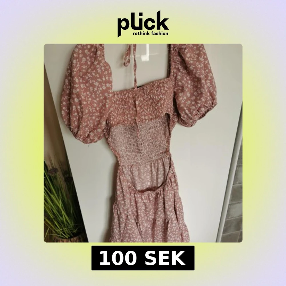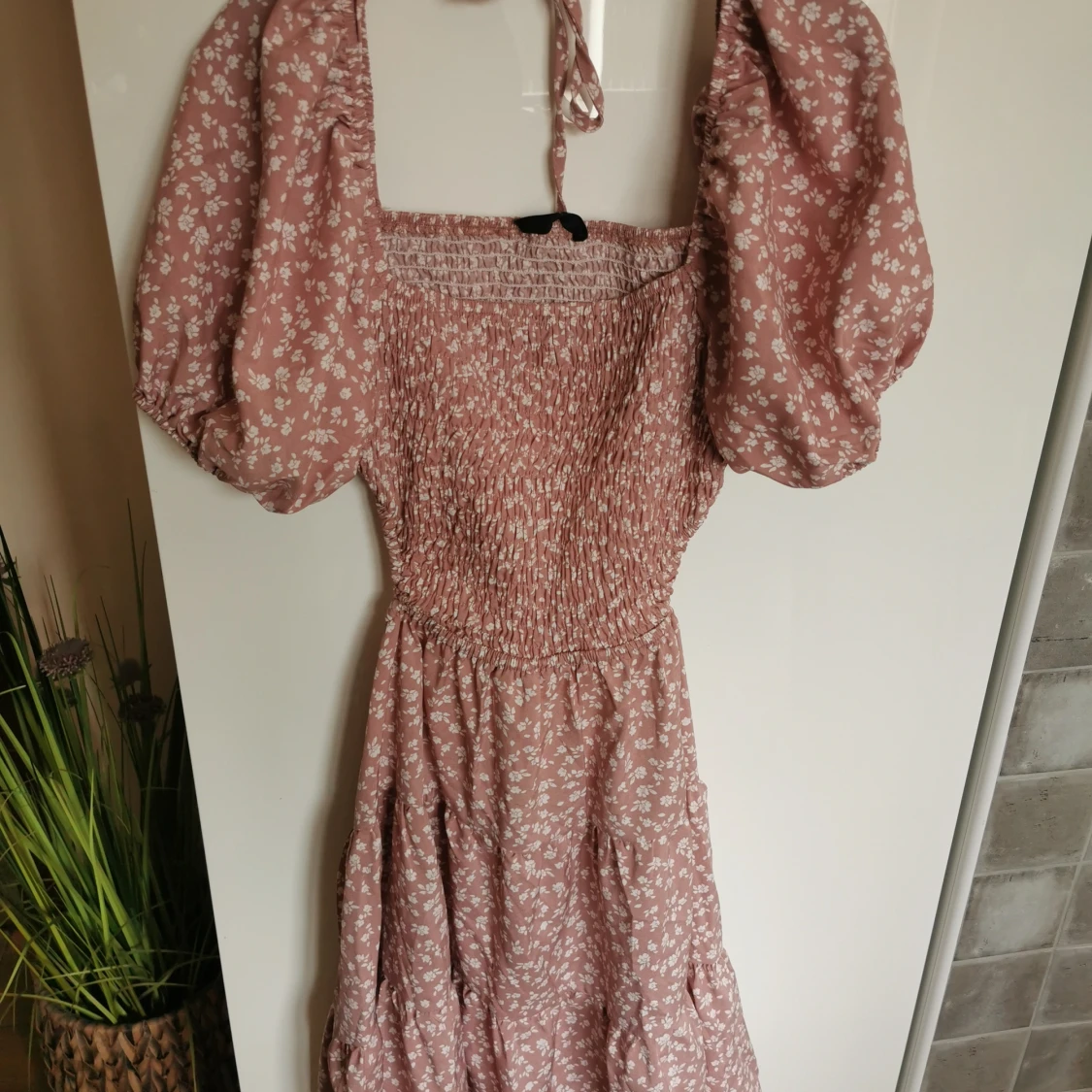Supersöt rosa klänning med små vita blommor och puffiga kortärmar. Smockad upptill och i midjan för en bekväm passform. Klänningen har en romantisk känsla och knytband i nacken.