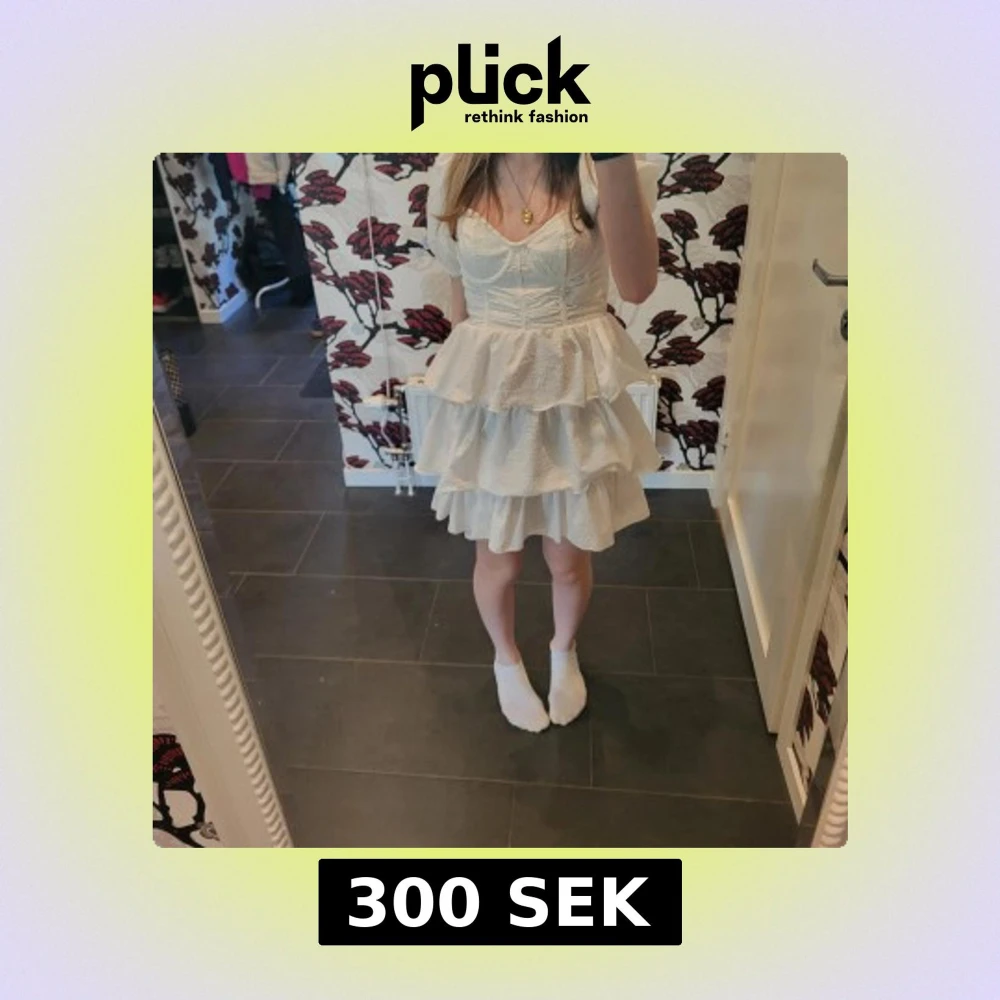 Supersöt vit kortklänning med flera volanger och puffärmar från PrettyLittleThing. Klänningen har v-ringning, markerad midja och struktur i tyget. Perfekt för somriga tillfällen och studentfirande.