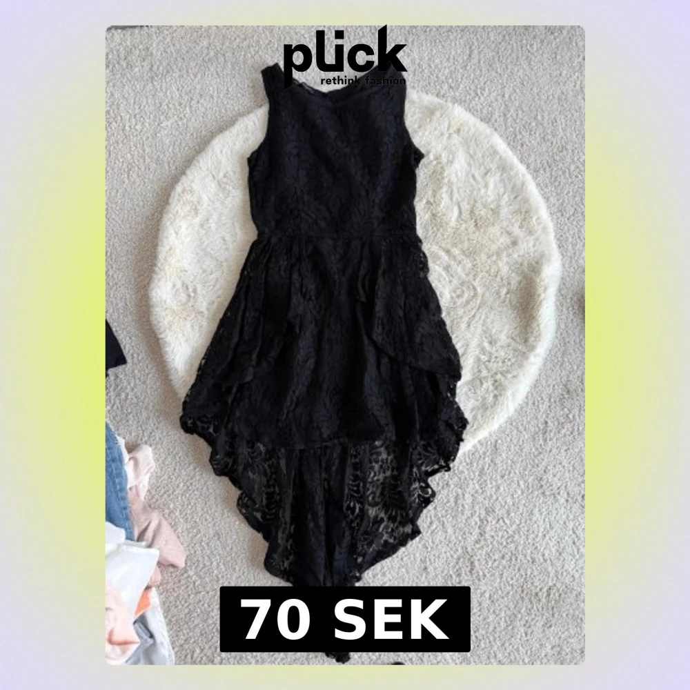Säljer en svart klänning med asymmetrisk kjol och vacker spetsdetalj. Klänningen är ärmlös och har en elegant, figurnära passform med unikt fall baktill som ger extra edge till looken.