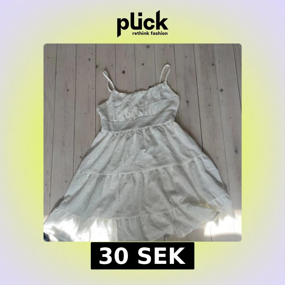 Söt vit klänning med smala, justerbara axelband och lätt volang i kjolen. Klänningen har resår i ryggen och är sydd i ett tunt, luftigt tyg med diskret struktur. Perfekt för varma dagar och har en romantisk känsla. Ens axelbandet är av med funkar med en säkerhetsnål