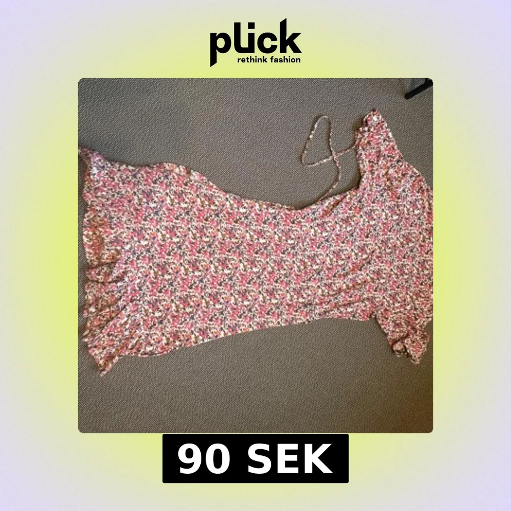 Använd fåtal gånger. Supersöt klänning med blommigt mönster i rosa, vit, blå och gul. Omlottmodell med knyt i midjan, v-ringning och volangkant nertill. Halvlånga ärmar och mjukt, lätt material – perfekt för varma dagar.