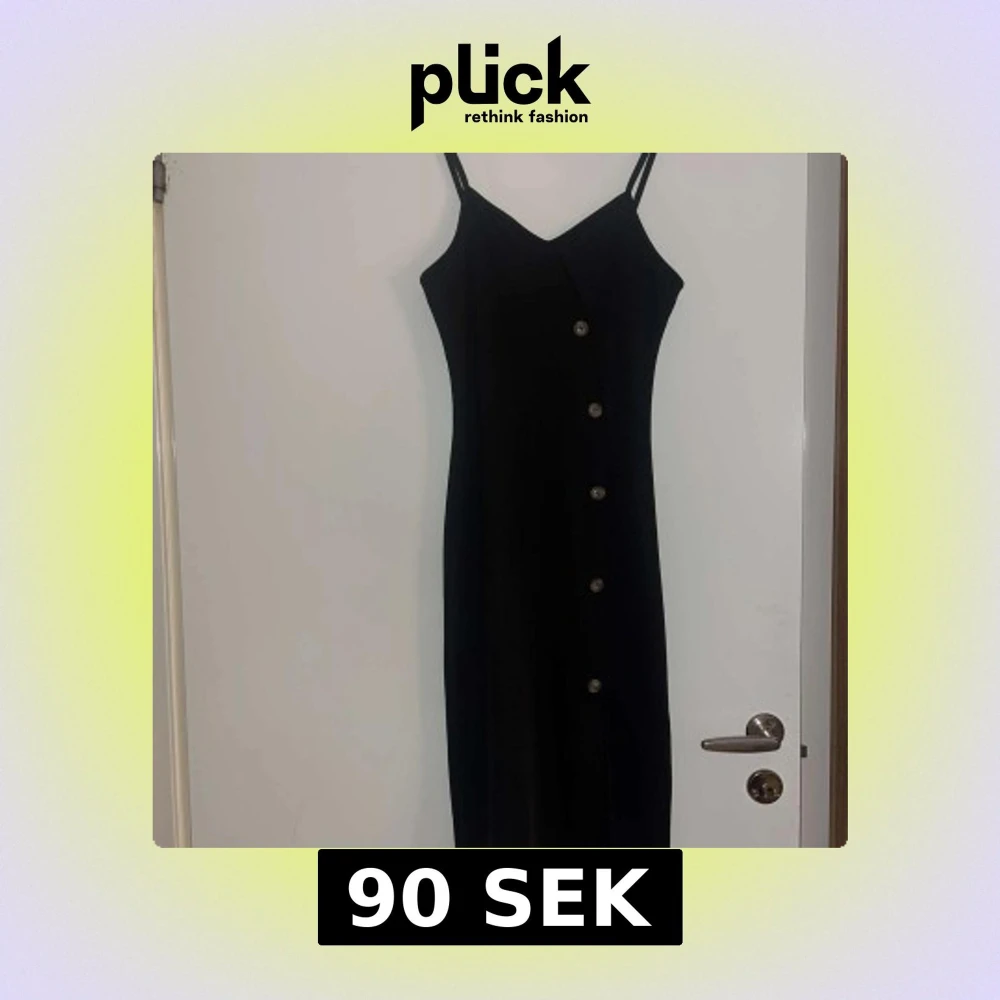 En stilren svart långklänning med smala axelband och snygg v-ringning. Klänningen har dekorativa knappar längs ena sidan framtill som ger en cool detalj. Passformen är figurnära och modellen är enkel men elegant.