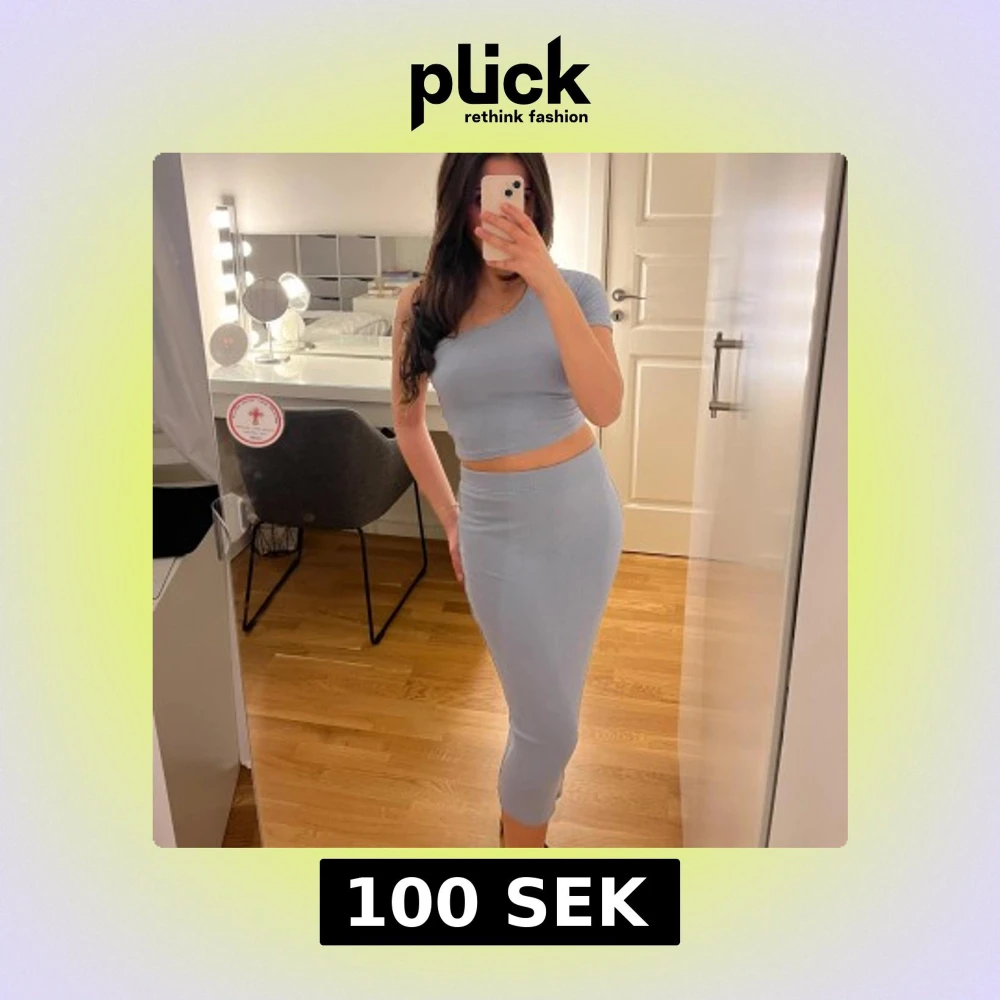 Snyggt ljusblått set med en oneshoulder topp och matchande kjol. Toppen är ribbad och kortärmad, vilket ger en trendig look. Perfekt för en stilren och modern outfit.