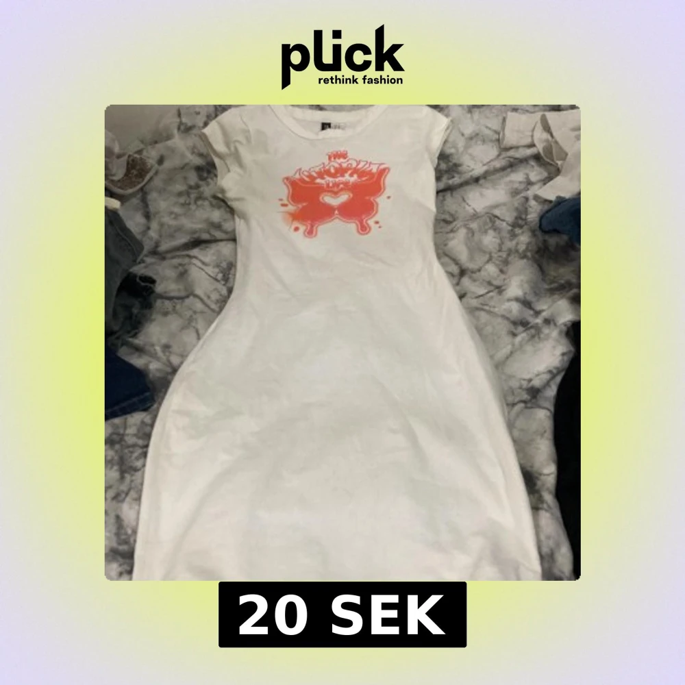 Säljer en vit kortklänning från H&M Divided i storlek XS. Klänningen har ett coolt orange tryck med texten 'The Utopia Life' och en fjäril med hjärta på bröstet. Modellen är figurnära med korta ärmar och rund hals. Perfekt för dig som gillar streetstyle och grafiska prints.