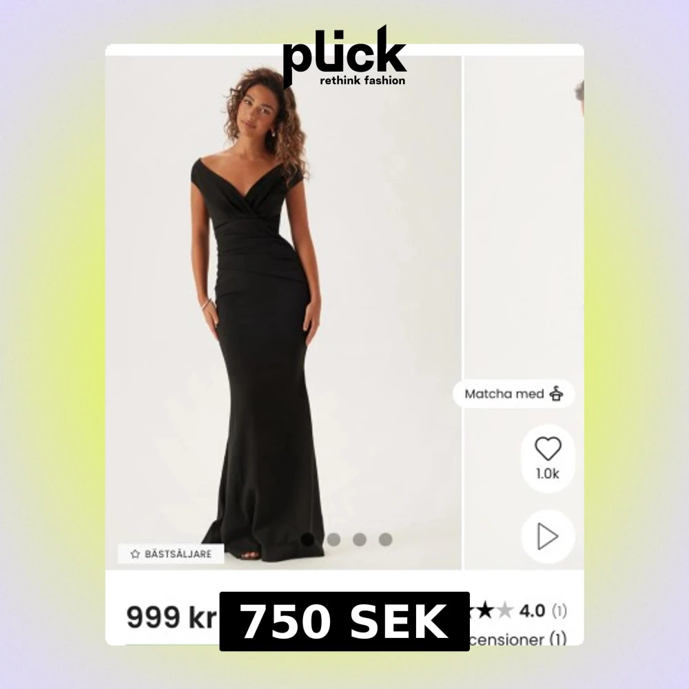 Supersnygg svart långklänning med omlott och v-ringad offshoulder-ringning. Använt den 1 gång så den är nästan helt ny, vill ni ha fler bilder är det bara att skriva! I dessa klänningar tar man alltid en storlek mindre. Är öppen med att diskutera priset