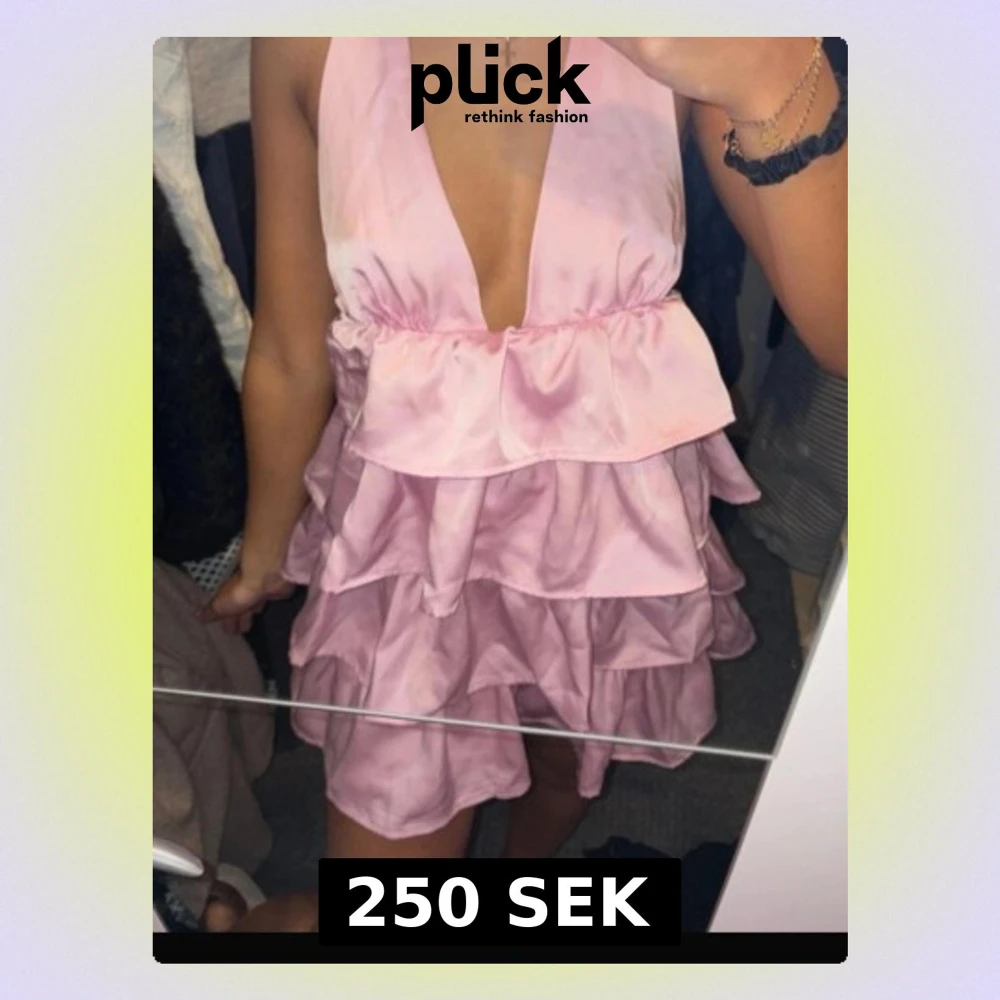 Supersöt rosa kortklänning med flera volanger och djup v-ringning. Klänningen har ärmlös design och är gjord i ett glansigt, satinliknande material som ger en lyxig känsla. Perfekt för dig som vill sticka ut med en feminin och trendig look. Från shein
