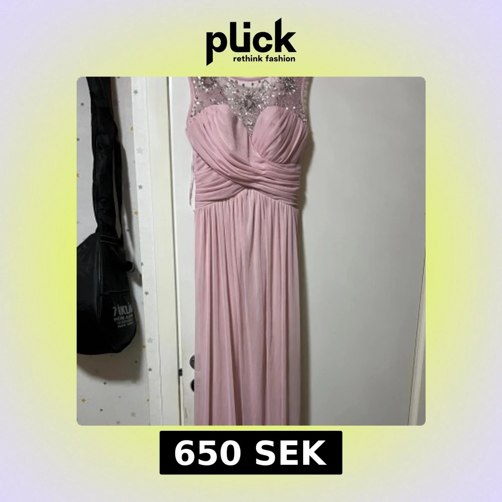 Ljusrosa långklänning med vackert draperad överdel och transparent mesh upptill, dekorerad med glittrande pärlor och stenar. Klänningen har markerad midja, lätt utställd kjol och är ärmlös. Perfekt för bal eller speciella tillfällen. Men de råkar spillas lite sås på den vid bröstet, priset går att diskutera