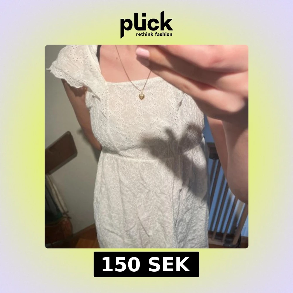 Säljer en söt vit klänning med broderade detaljer och volang vid axlarna. Klänningen har en feminin passform och är ärmlös med spetsinslag. Perfekt för skolavslutningen, midsommar eller student!