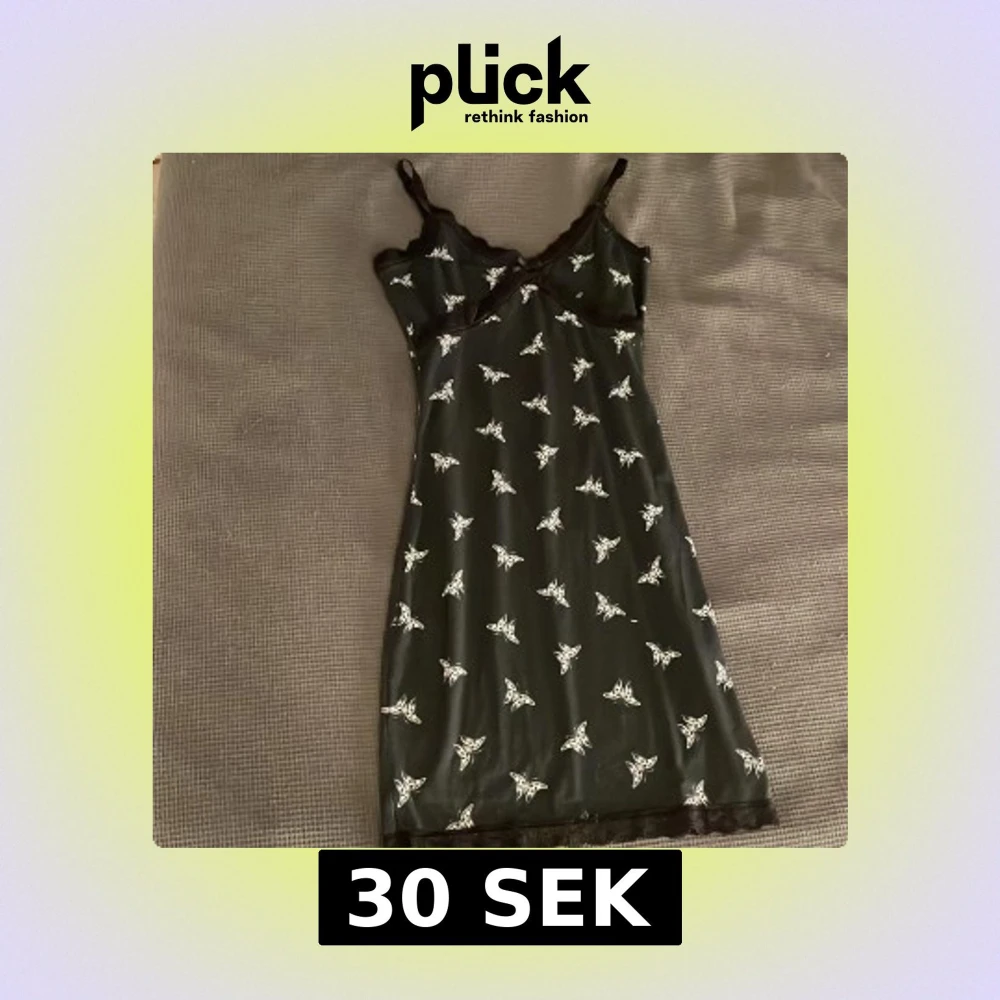 Snygg svart kort klänning från H&M DIVIDED i storlek XS. Klänningen har vita fjärilsmönster över hela tyget och tunna axelband. Spetsdetaljer vid halsringningen och nederkanten ger en extra touch. Perfekt för dig som gillar en cool och söt stil.