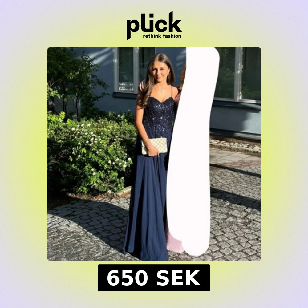 Säljer en marinblå långklänning med smala axelband och glittrig paljettöverdel. Klänningen har en elegant, figurnära överdel och ett långt, flödande kjolparti. Perfekt för bal eller festliga tillfällen.den har knyt detaljer i ryggen, kom privat för detaljerade bilder
