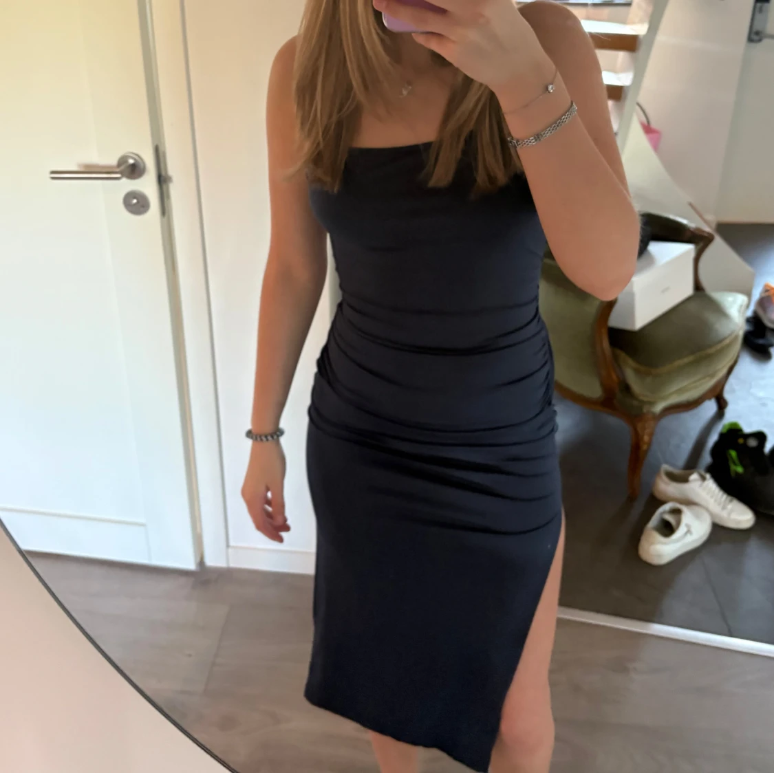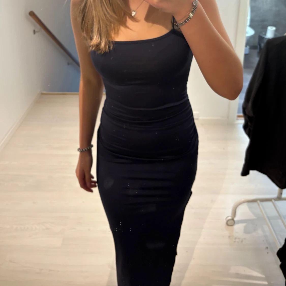 Säljer en elegant mörkblå långklänning med smala axelband och öppen rygg. Klänningen har en tight passform och en snygg slits på sidan.💓Har använt enstaka gånger💓