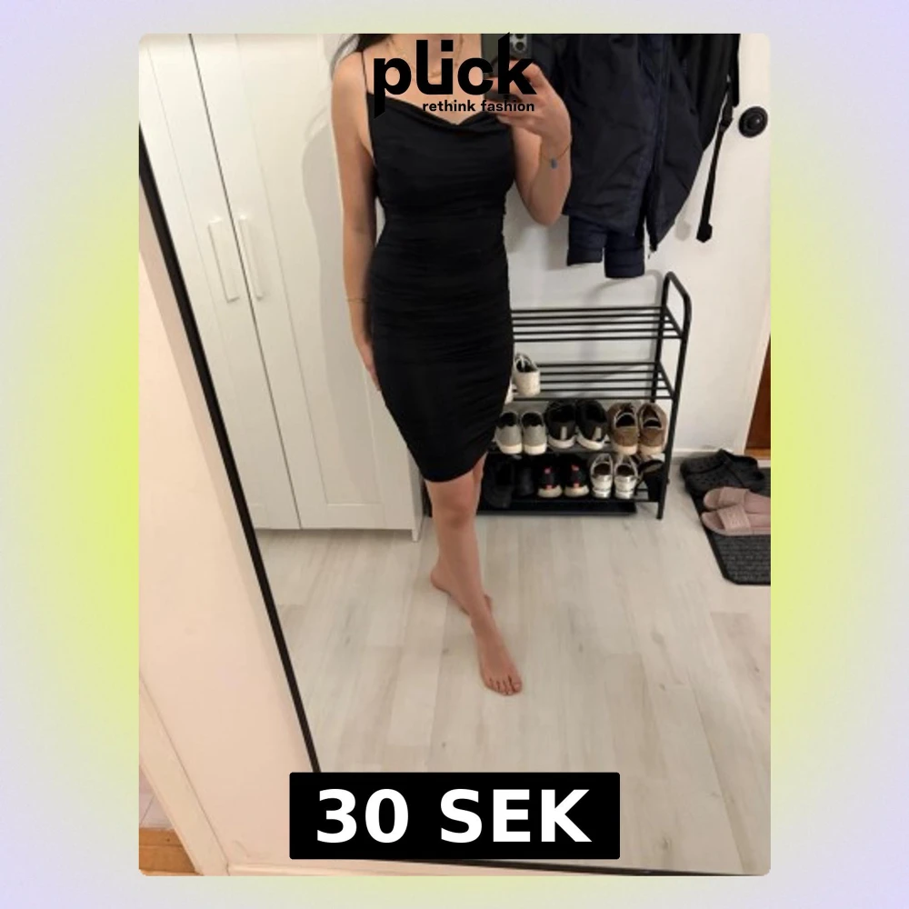 Säljer en svart, tight klänning med smala axelband och figurnära passform. Klänningen är kort och har en enkel, stilren design som framhäver siluetten. Perfekt för dig som gillar minimalistisk stil och vill ha en klassisk svart klänning i garderoben.