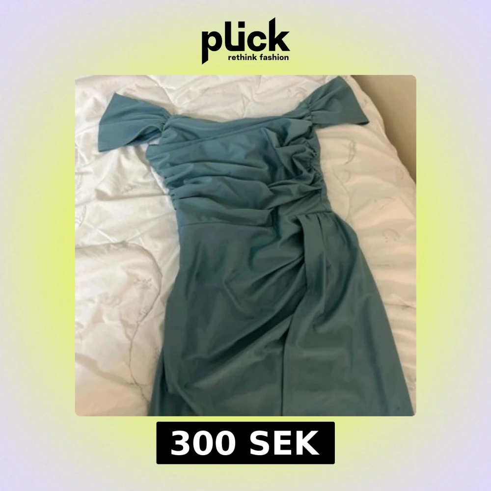 Supersnygg ljusblå långklänning med offshoulder och draperad överdel. Klänningen har en elegant slits och fina detaljer vid axlarna. Perfekt för dig som vill sticka ut med en stilren och modern look. Använd bara två gånger men den ser fortfarande sol helt ny.