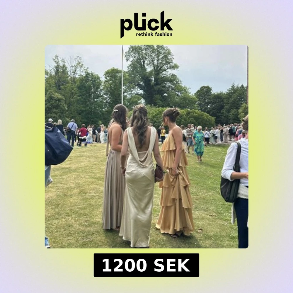 Elegant champagnefärgad balklänning med djup v-ringning och öppen rygg. Klänningen har en slät och glansig yta, vilket ger en lyxig känsla. Perfekt för formella tillfällen. Använd en gång bara😇🤩