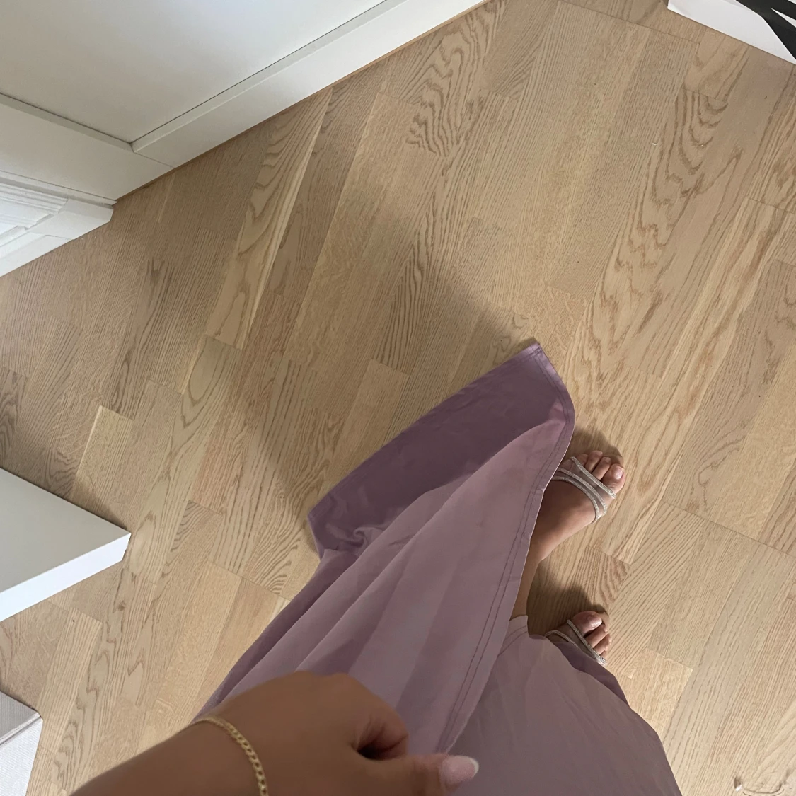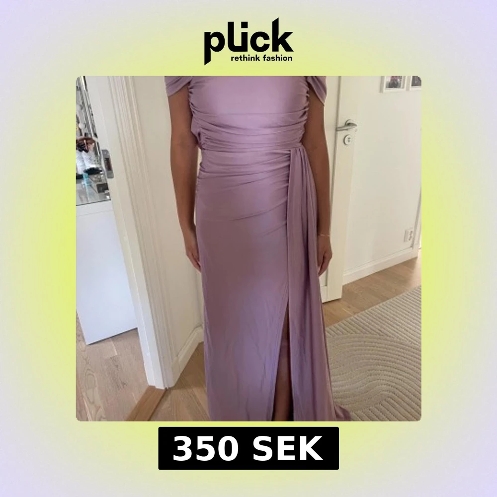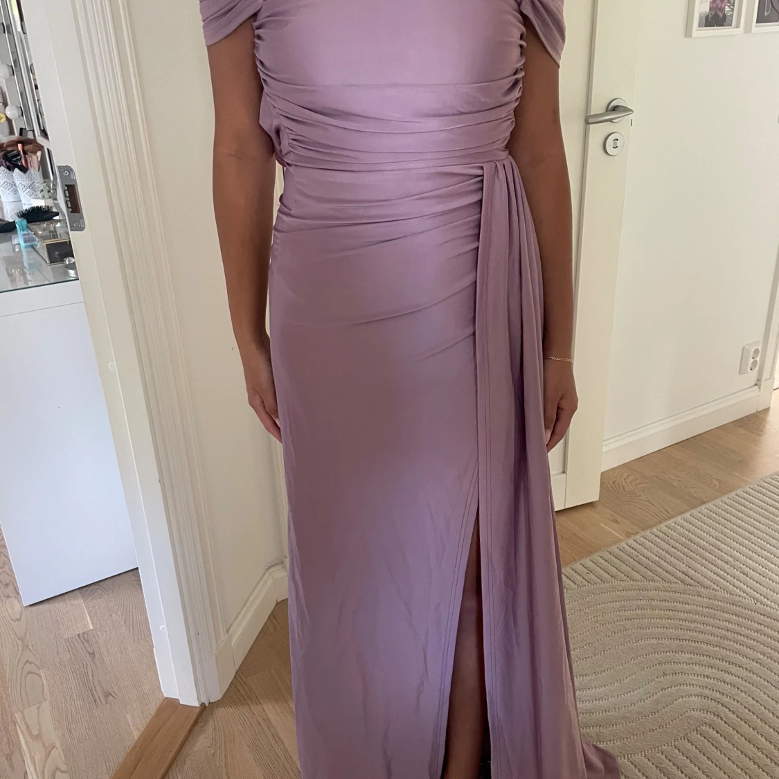 Säljer en elegant ljuslila långklänning med offshoulder-design och draperade detaljer runt midjan. Klänningen har en snygg slits framtill och ett mjukt, följsamt tyg som ger en lyxig känsla. Perfekt för dig som vill sticka ut med en feminin och modern look.