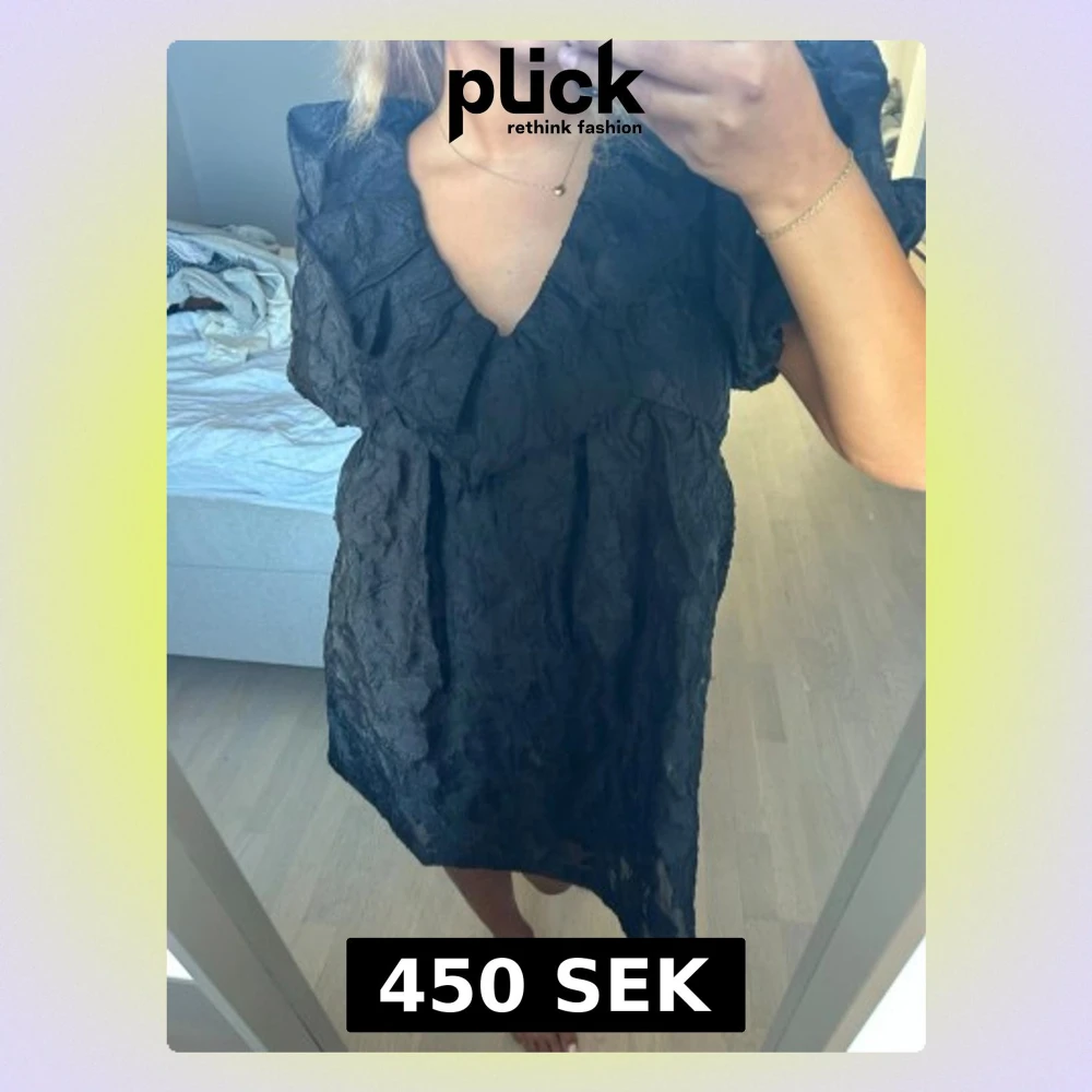 Snygg svart kort klänning med volangdetaljer och v-ringning. Klänningen har puffiga korta ärmar och en lätt strukturerad yta som ger en cool look. Perfekt för dig som vill sticka ut med en trendig och bekväm outfit. Använd en gång💕