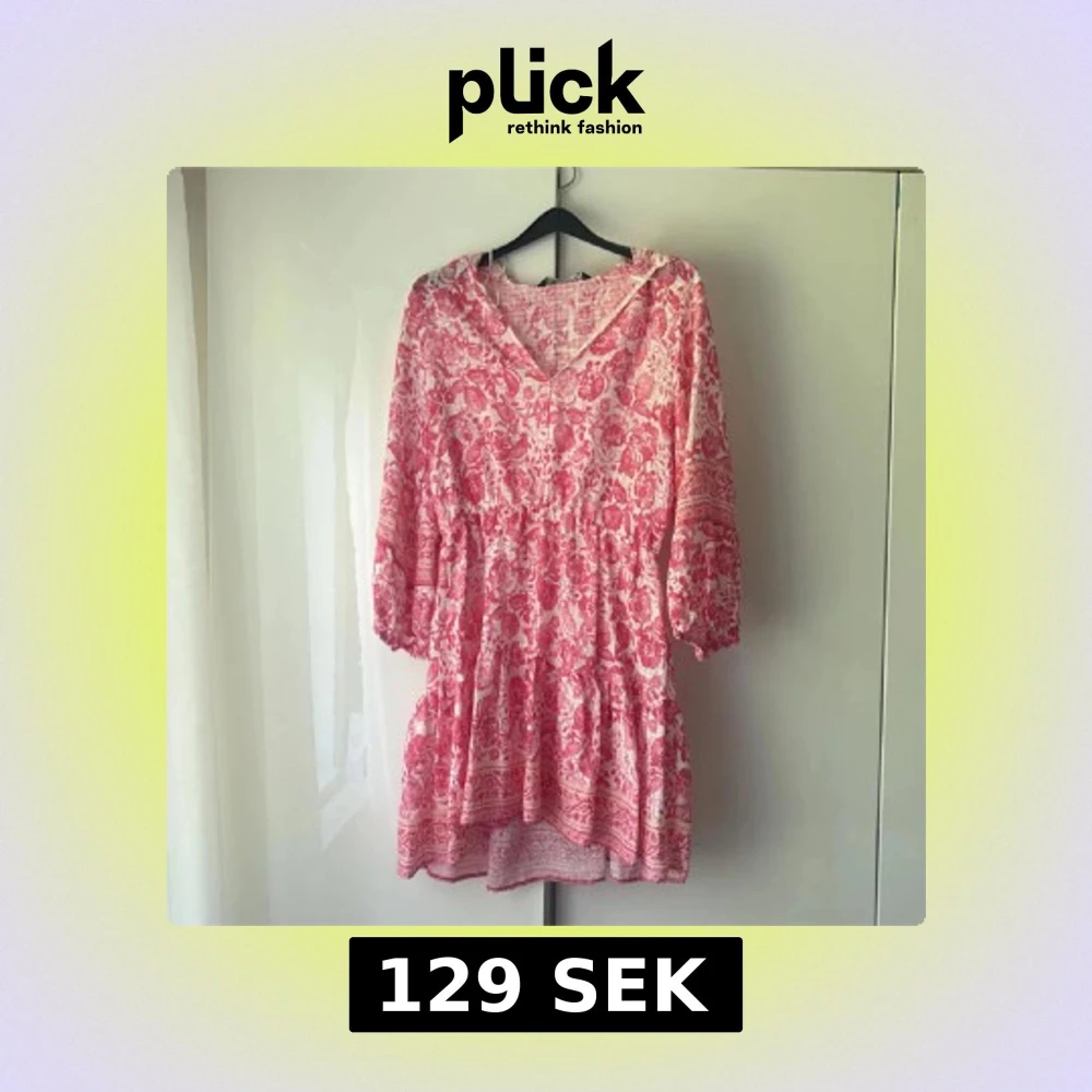Supersöt kortklänning i rosa och vitt med blommigt mönster och v-ringning. Klänningen har trekvartsärmar med lätt puff och volangdetaljer nertill. Perfekt för sommarens alla tillfällen!