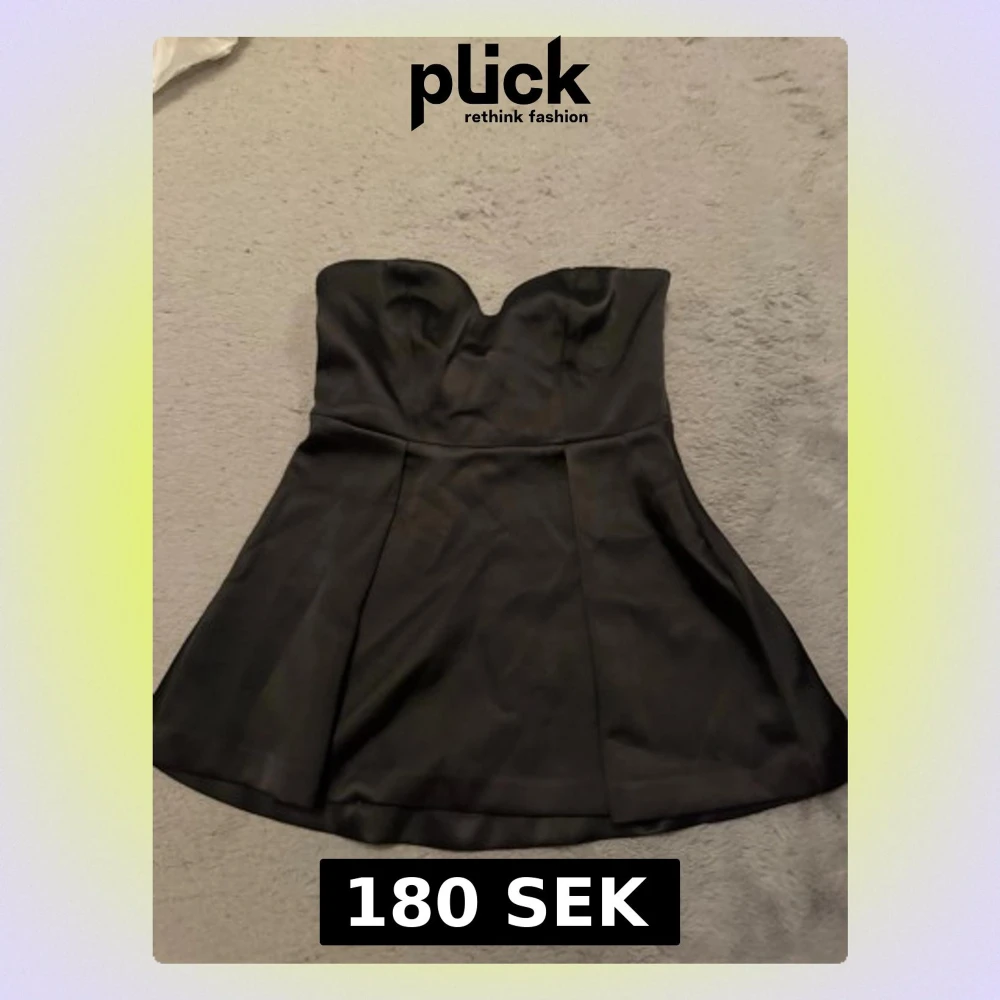 Säljer en svart topp i satinliknande material med hjärtformad urringning. Klänningen har en lätt utsvängd kjol och kan bäras både med och utan tunna axelband. Perfekt för dig som vill ha en enkel men snygg look.