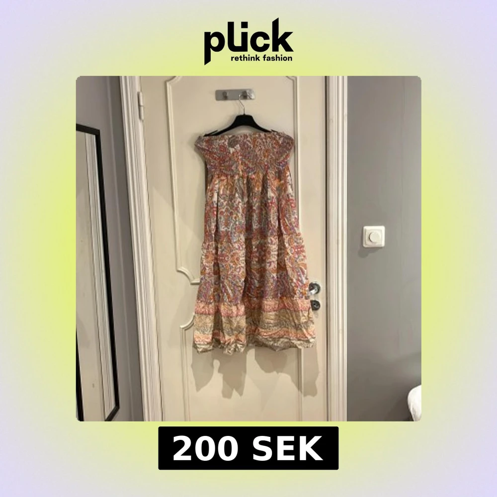 Säljer en bohemisk kortklänning med blommigt mönster i ljusa toner av beige, rosa och orange. Klänningen har smock upptill och volangdetaljer nedtill, perfekt för sommarens alla tillfällen. Materialet känns lätt och luftigt, och modellen är offshoulder.