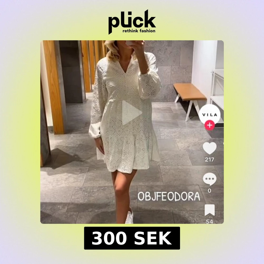 Supersöt vit kortklänning från Object med v-ringning och långa ärmar. Klänningen har broderade spetsdetaljer och volang nedtill, vilket ger en romantisk vibe. Perfekt för studenten. Materialet är bomull och den har en loose passform.