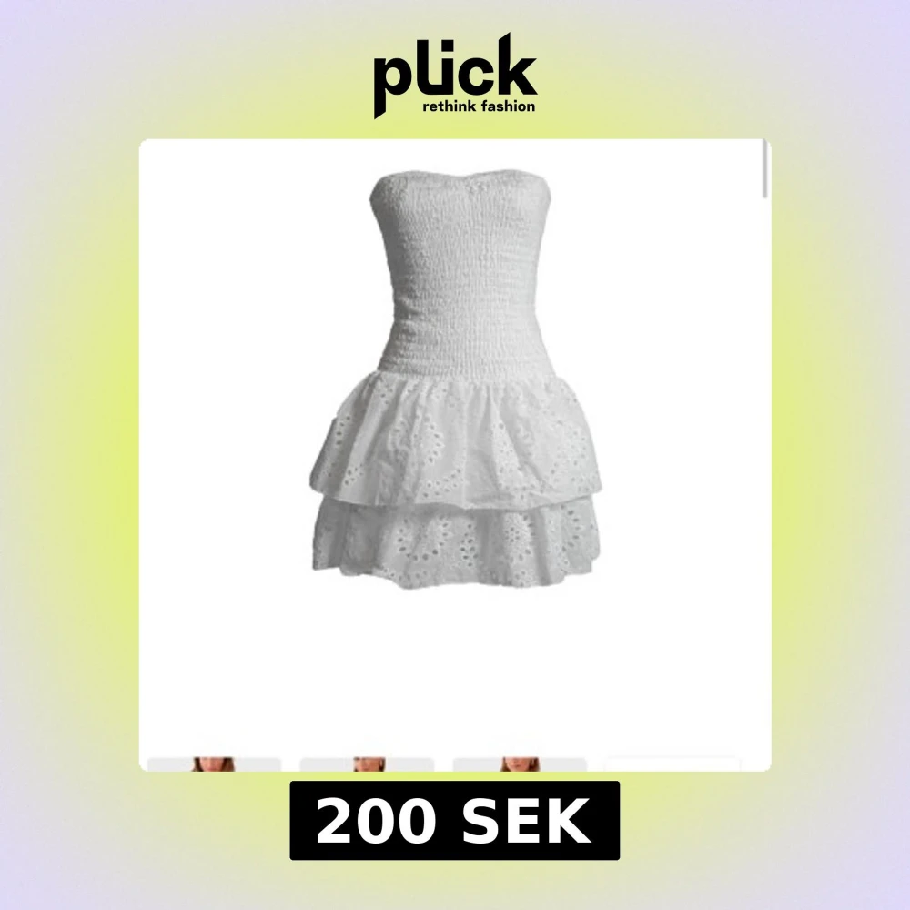 Söt vit axelbandslös klänning med smockad överdel och volangkjol. Den har inbyggda shorts och är perfekt till sommaren!