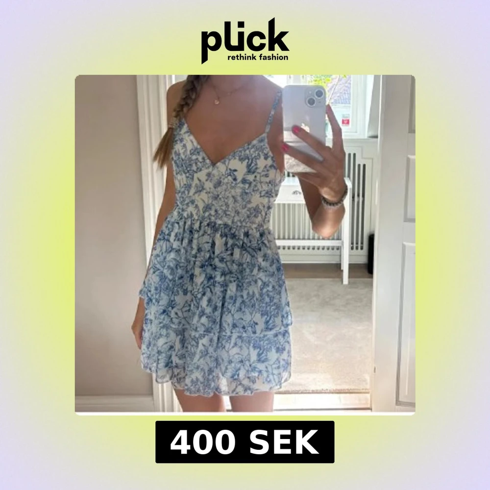 Superfin kortklänning med blått blommönster på vit botten. Klänningen har smala axelband, v-ringning och volangig. Köpte klänningen av en tjej men storleken var för liten där av vet jag inte märket🩵🩵🩵🩵