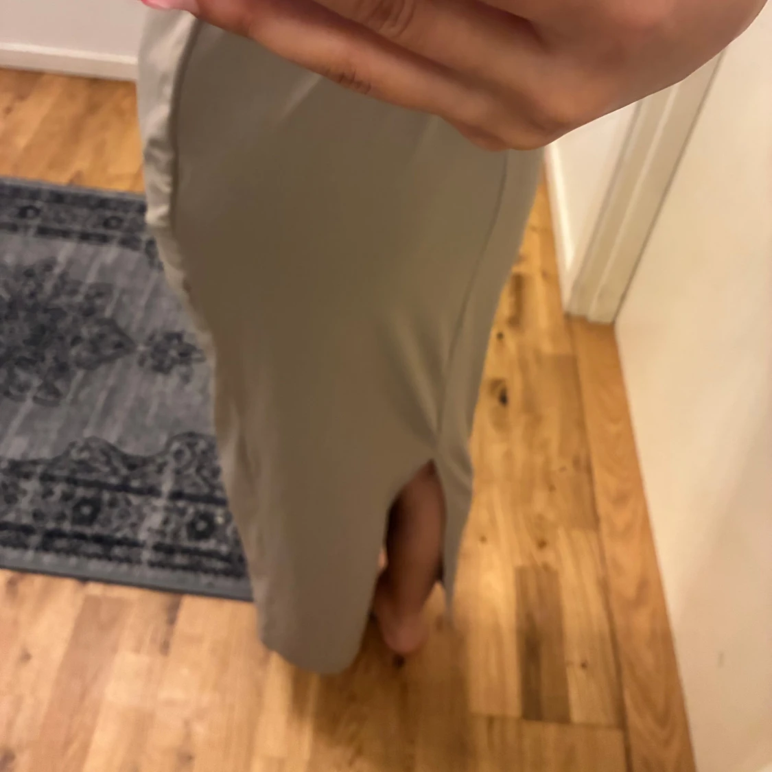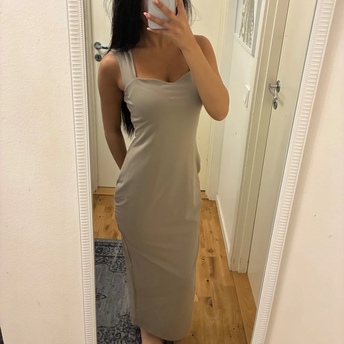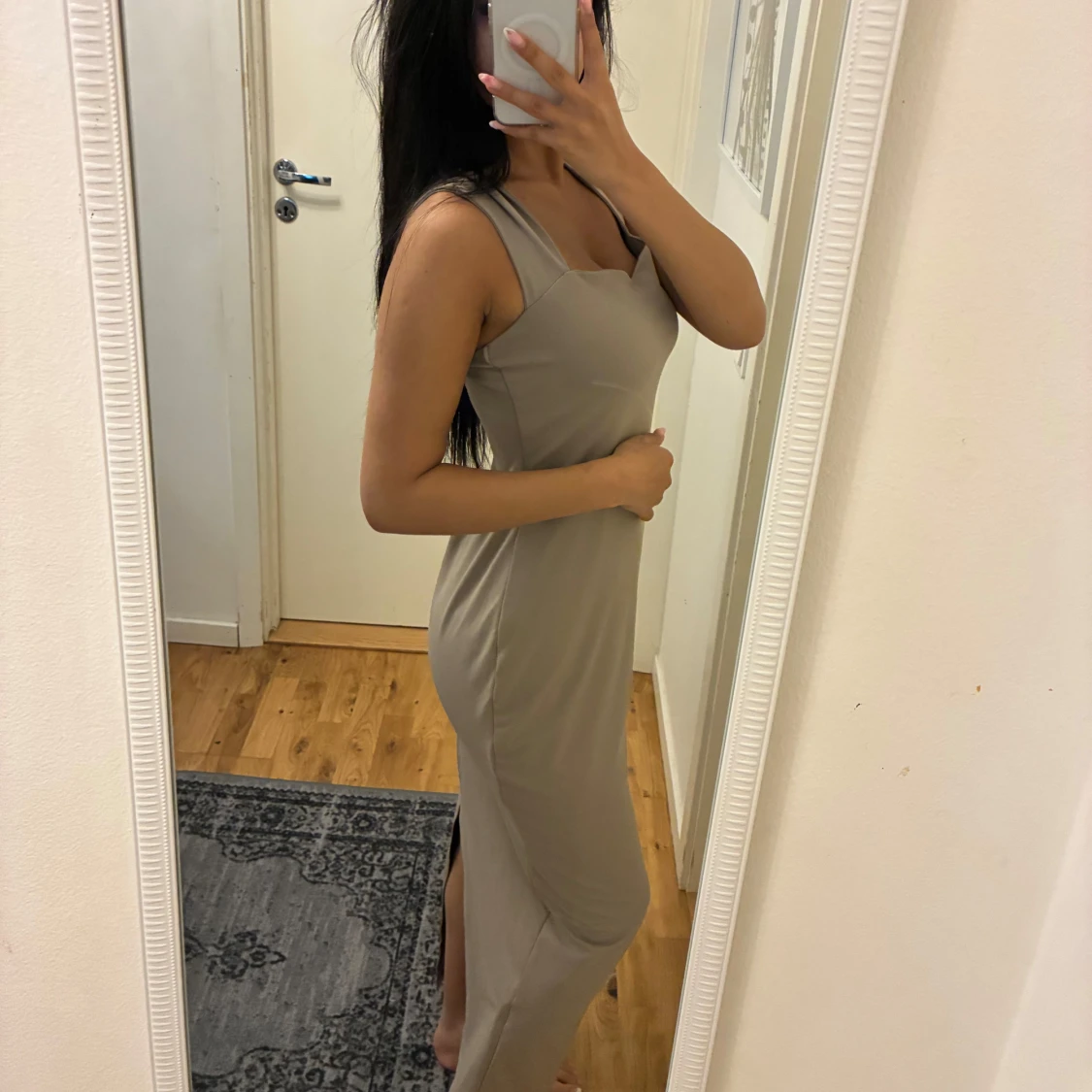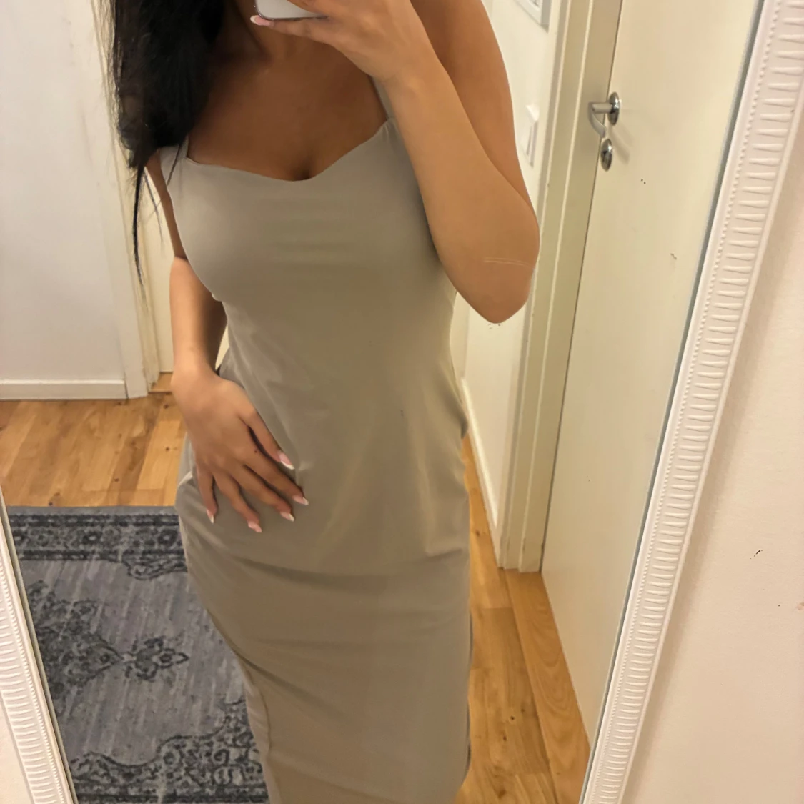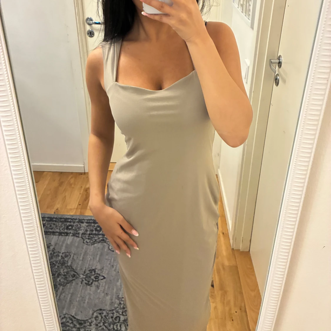 Säljer en stilren beige långklänning med breda axelband och lätt v-ringad halsringning. Klänningen har en figurnära passform och en diskret slits på sidan för extra rörelsefrihet. Perfekt för dig som gillar minimalistisk och trendig stil.