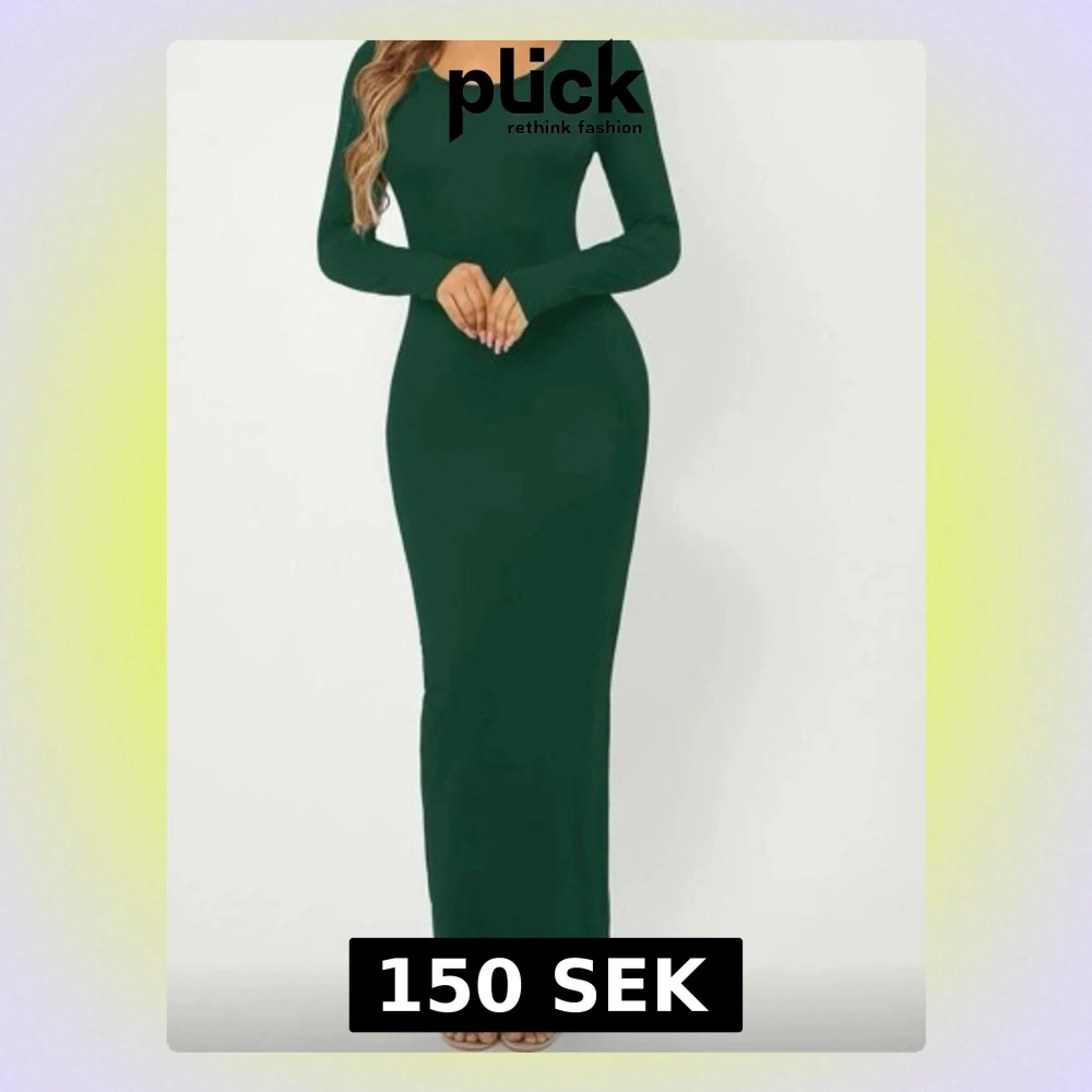 En stilren mörkgrön maxiklänning med lång ärm och rund halsringning. Klänningen har en figurnära passform och är helfärgad utan detaljer. Perfekt för dig som gillar en enkel men elegant look.