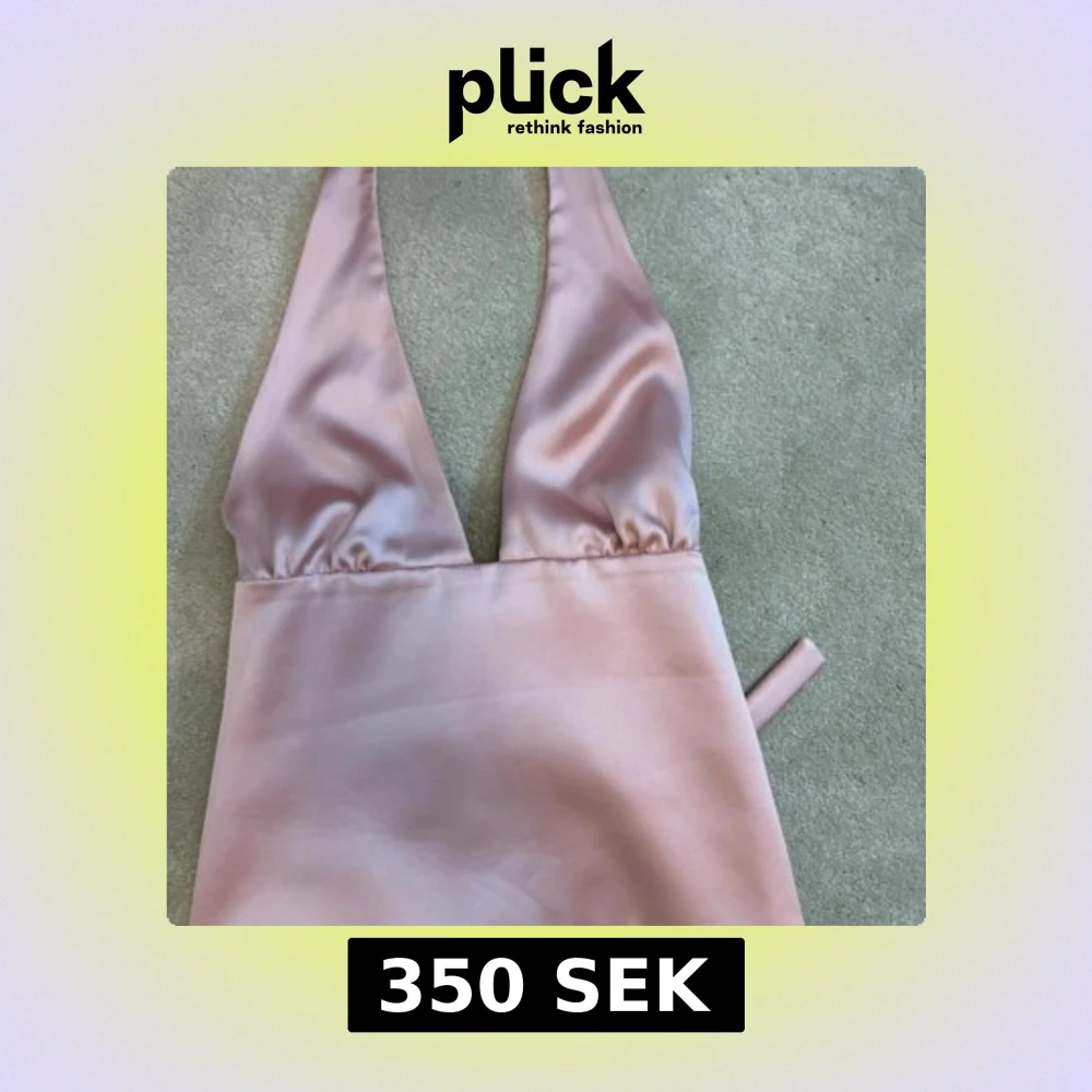 Supersnygg rosa klänning i satin med djup v-ringning och halterneck. Materialet är glansigt och mjukt, perfekt för dig som vill sticka ut. Klänningen har minimalistisk design och smala band som knyts i nacken.