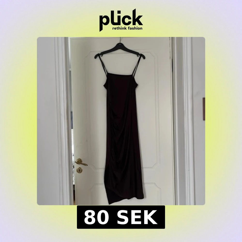 Säljer en mörkbrun långklänning med smala axelband och draperad detalj på ena sidan. Klänningen sitter tight och är tillverkad i ett mjukt, stretchigt material som faller snyggt. Perfekt för dig som gillar minimalistisk stil.