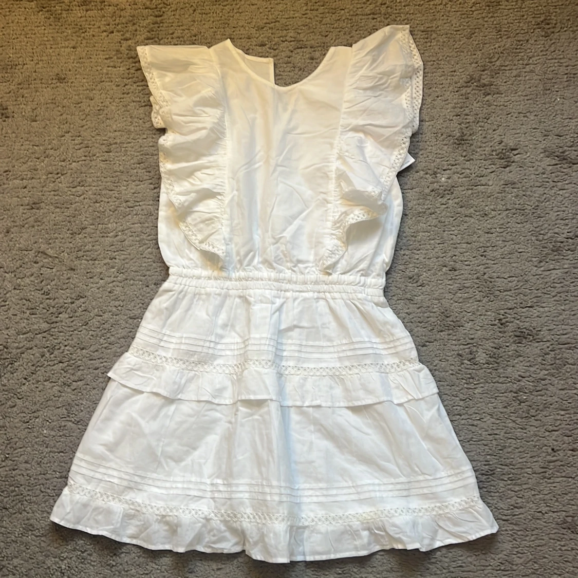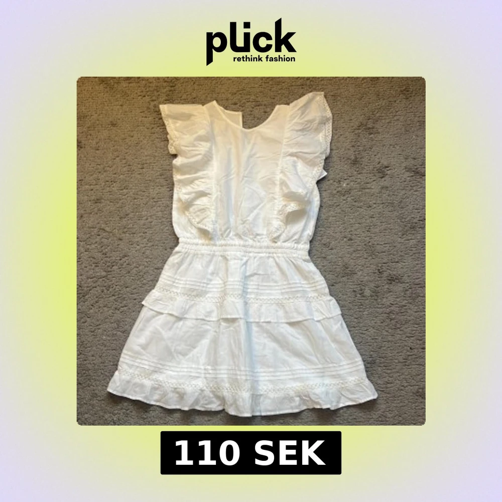 Superfin vit kortklänning med volanger på axlarna och kjolen, samt spetsdetaljer längs kanterna. Klänningen har resår i midjan för en snygg passform och är ärmlös. Perfekt för sommarens alla tillfällen!