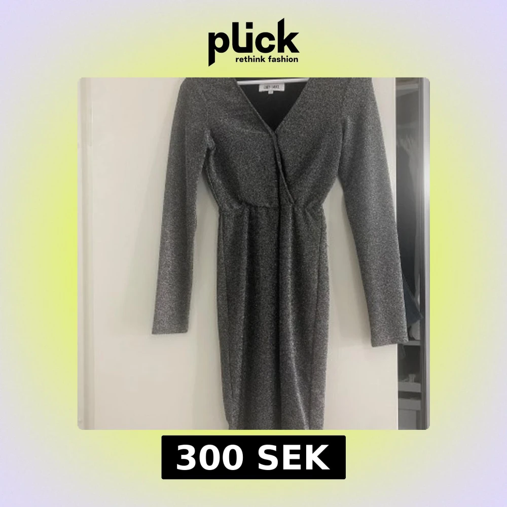 Snygg glittrig klänning med omlottdesign och v-ringning. Klänningen har långa ärmar och en figurnära passform som framhäver silhuetten. Perfekt för en kväll ute!
