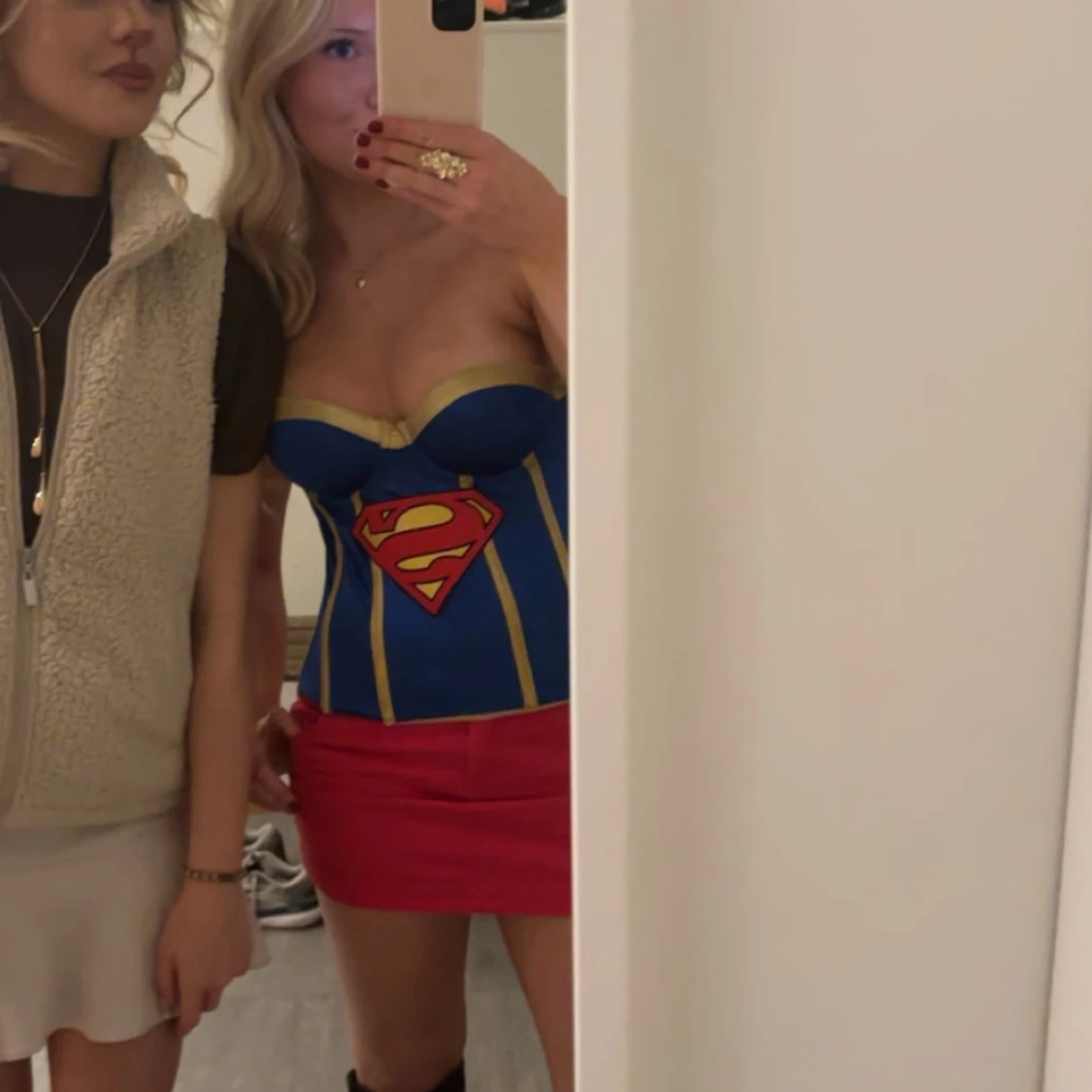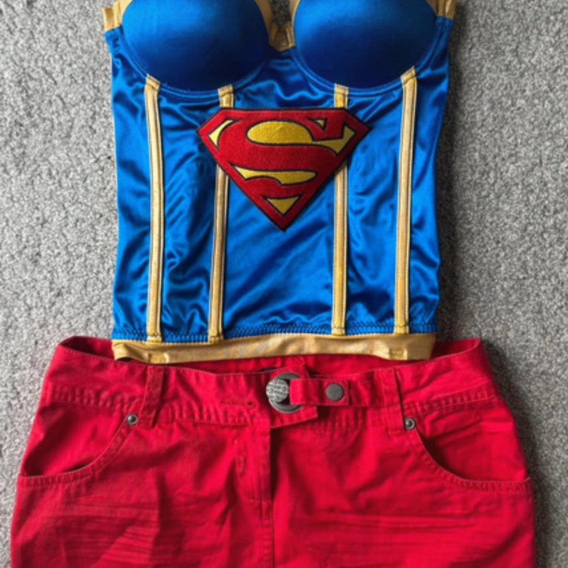 Superwoman halloween dräckt men snygg korsett topp och röd kort kjol. Kjolen passar xs och toppen skulle jag säga är ca en B kupa. Perfekt för temafest, halloween eller maskerad!