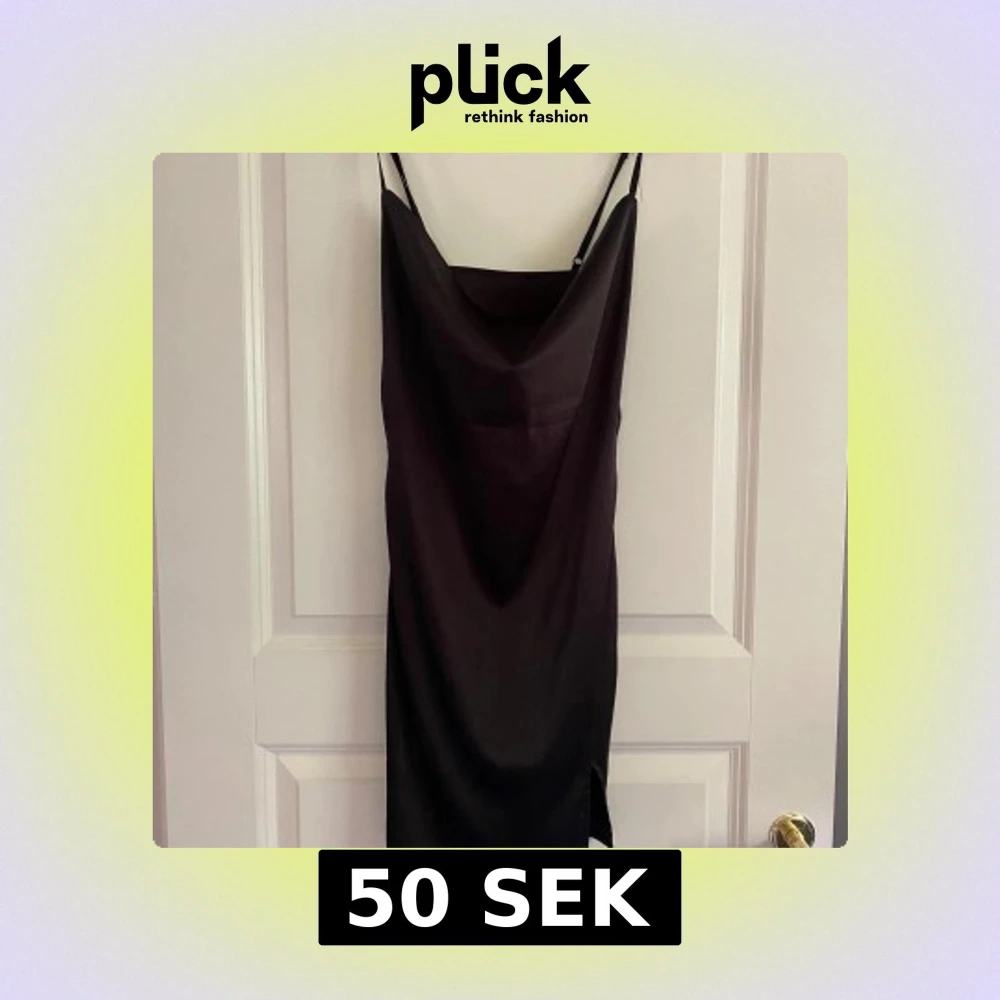 Svart satinklänning i storlek XS med tunna axelband och snygg draperad urringning. Klänningen har en liten slits på ena sidan