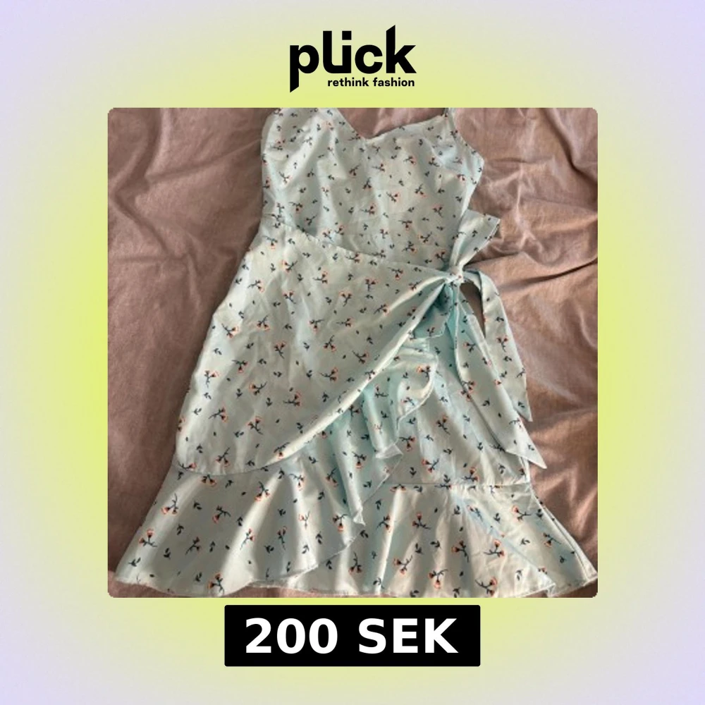 Superfin ljusblå kort omlottklänning med små blommor i orange och mörkblått. Klänningen har smala axelband, volangkant nertill och knyt i midjan. Perfekt för varma dagar och ger en söt och somrig vibe.