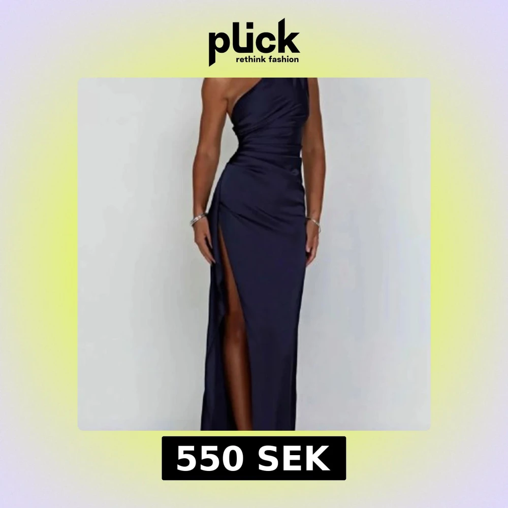 Säljer en elegant mörkblå långklänning i satin med hög slits och oneshoulder-design. Klänningen har draperad midja och smal passform som framhäver figuren. Perfekt för bal eller fest.