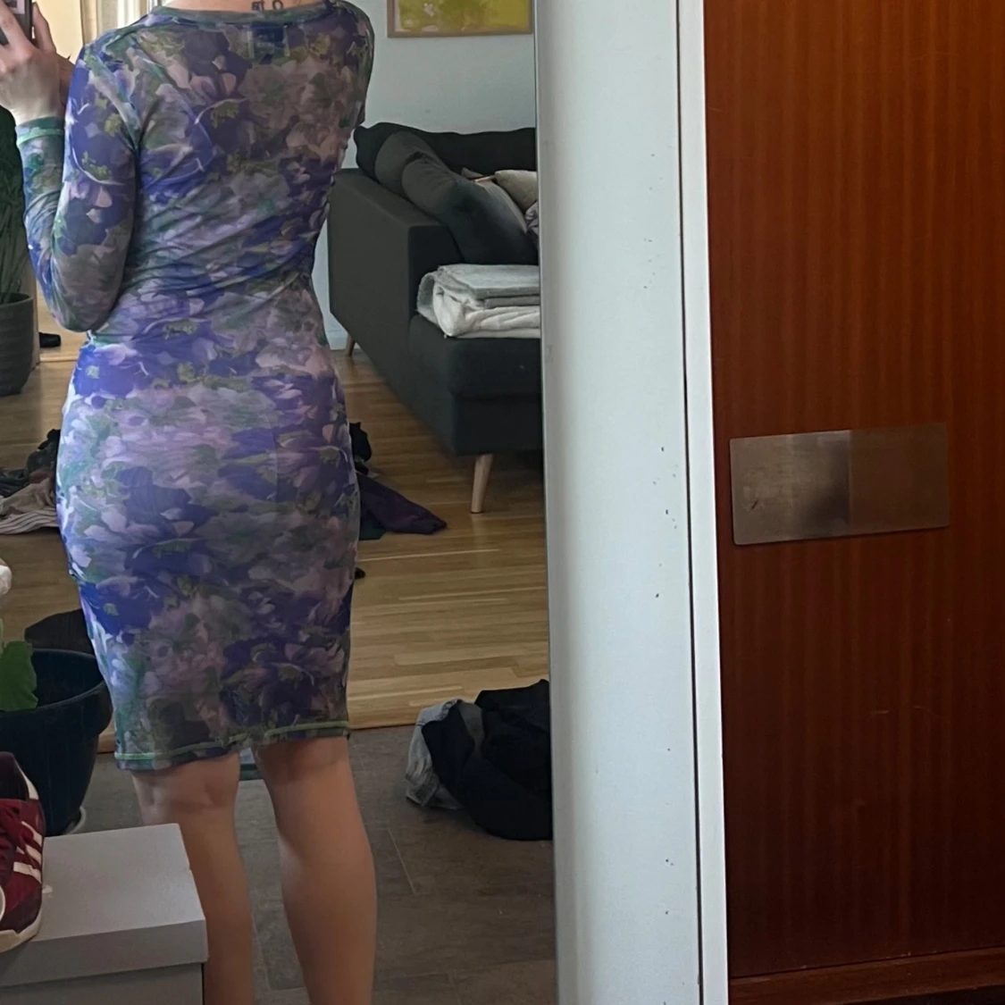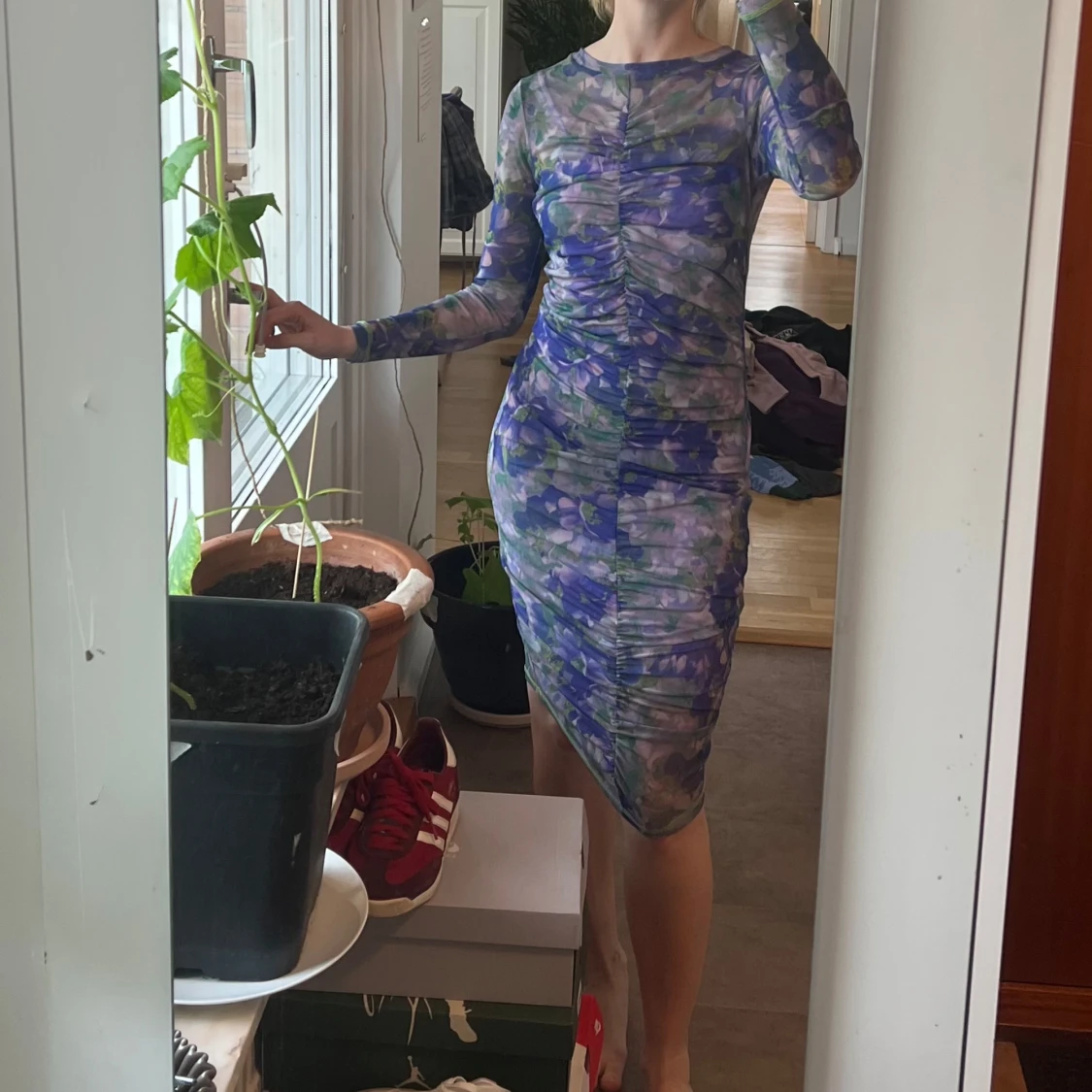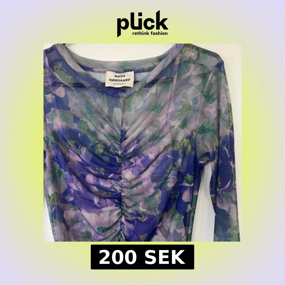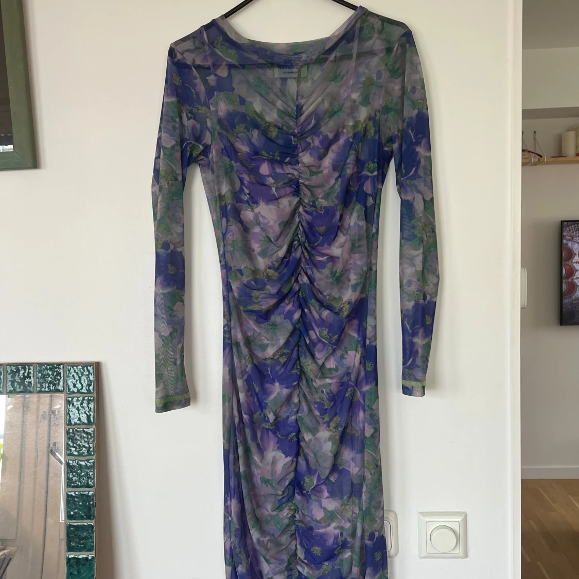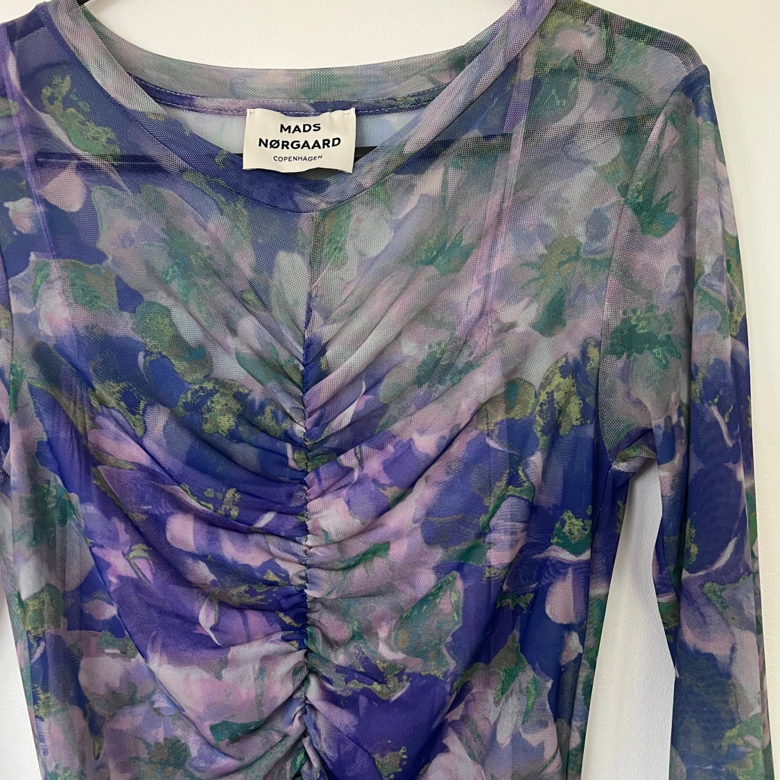 Säljer en långärmad, tight meshklänning från Mads Nørgaard med blommigt mönster i lila, grönt och blått. Klänningen har rynkade detaljer framtill och är i genomskinligt material. Perfekt för dig som vill sticka ut med färg och mönster.