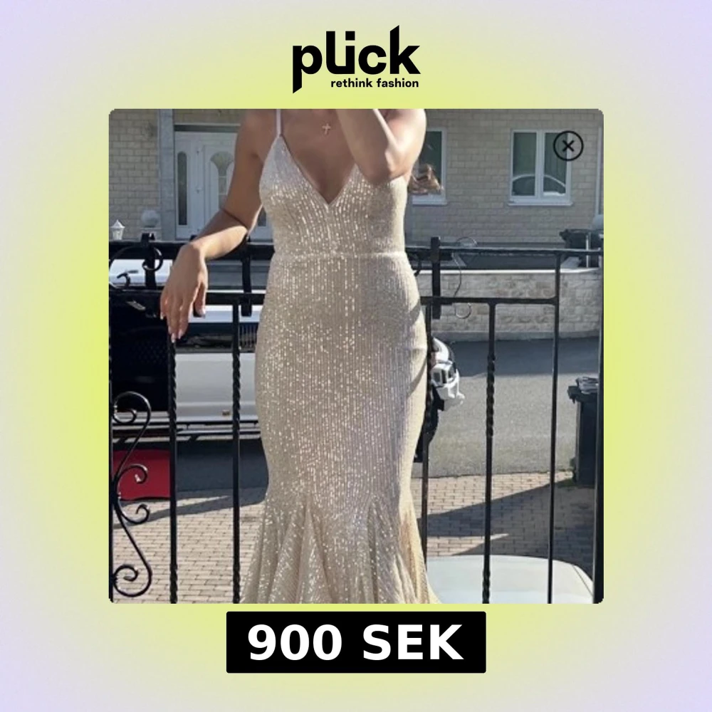 Säljer en champagnefärgad långklänning med smala axelband och v-ringad urringning. Klänningen är täckt av glittriga paljetter och har en figurnära passform med volangdetaljer nedtill som ger extra flärd. Perfekt för dig som vill sticka ut med en elegant och glamorös look. LÅNADE BILDER! Skicka till mig om ni vill ha en bild när jag har den på mig💕