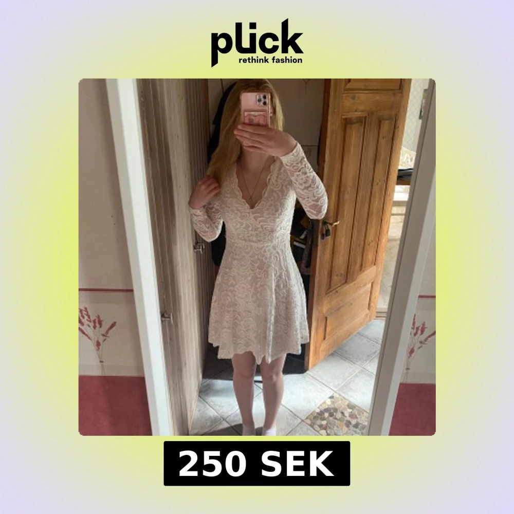 Säljer en söt vit klänning med v-ringad hals och långa ärmar. Klänningen har spetsdetaljer över hela och en lätt utställd kjol som slutar ovanför knäna. Perfekt för sommarens tillfällen eller studentfirande.