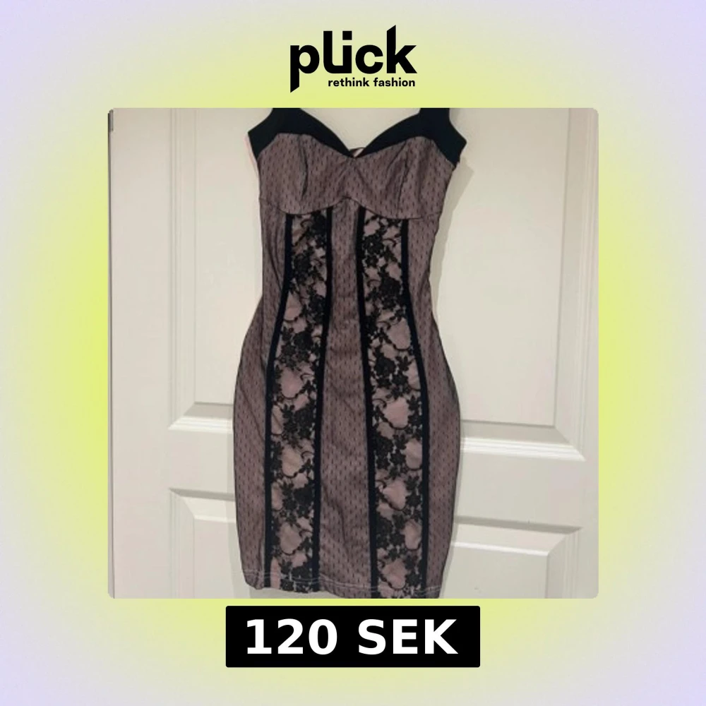 Säljer en figurnära klänning i svart och rosa med breda axelband, spetsdetaljer framtill och snörning längs ryggen. Klänningen har en markerad byst och är kort i modellen, perfekt för dig som gillar en edgy och feminin stil.