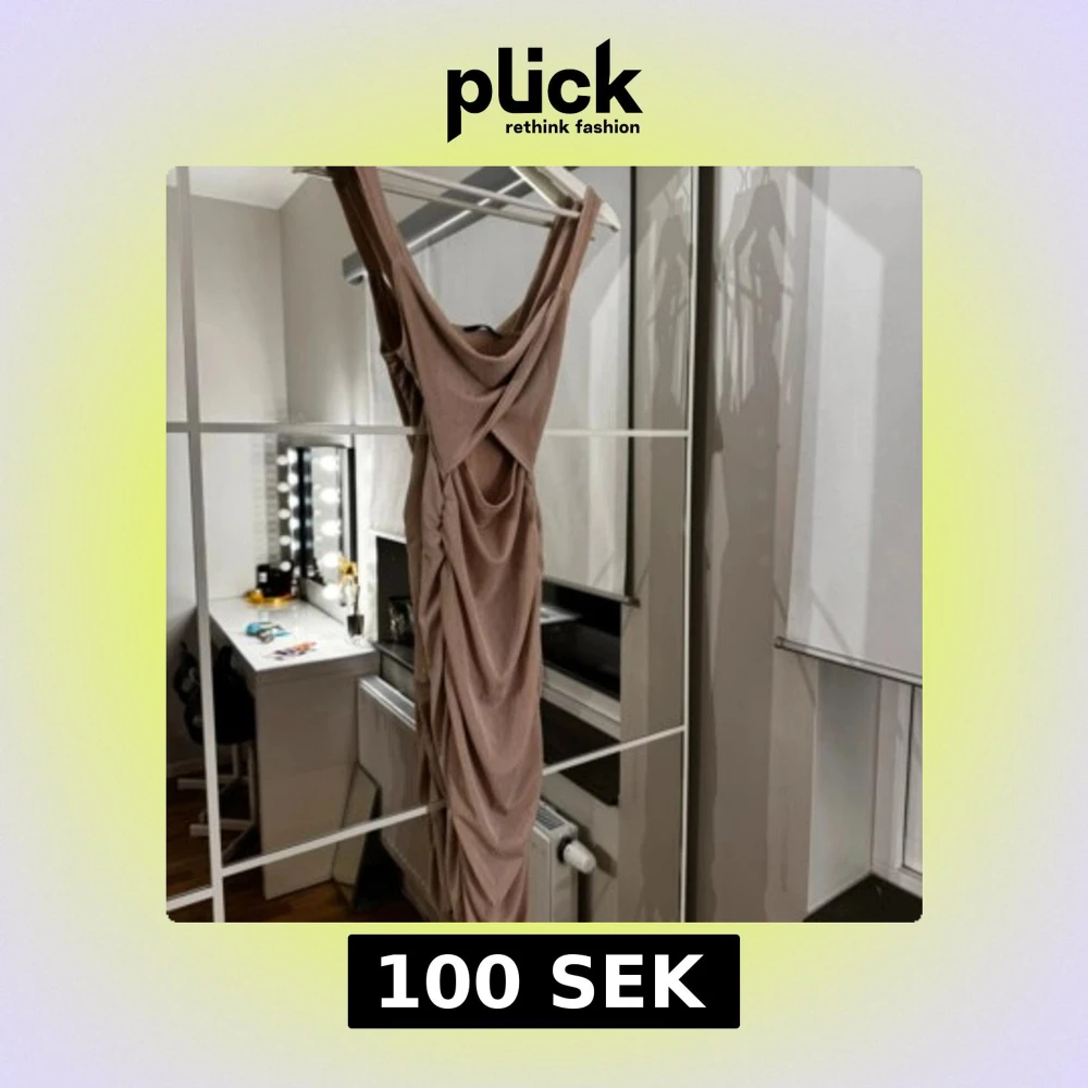 Elegant beige omlottklänning med draperad design. Klänningen har en smickrande passform och är perfekt för speciella tillfällen.