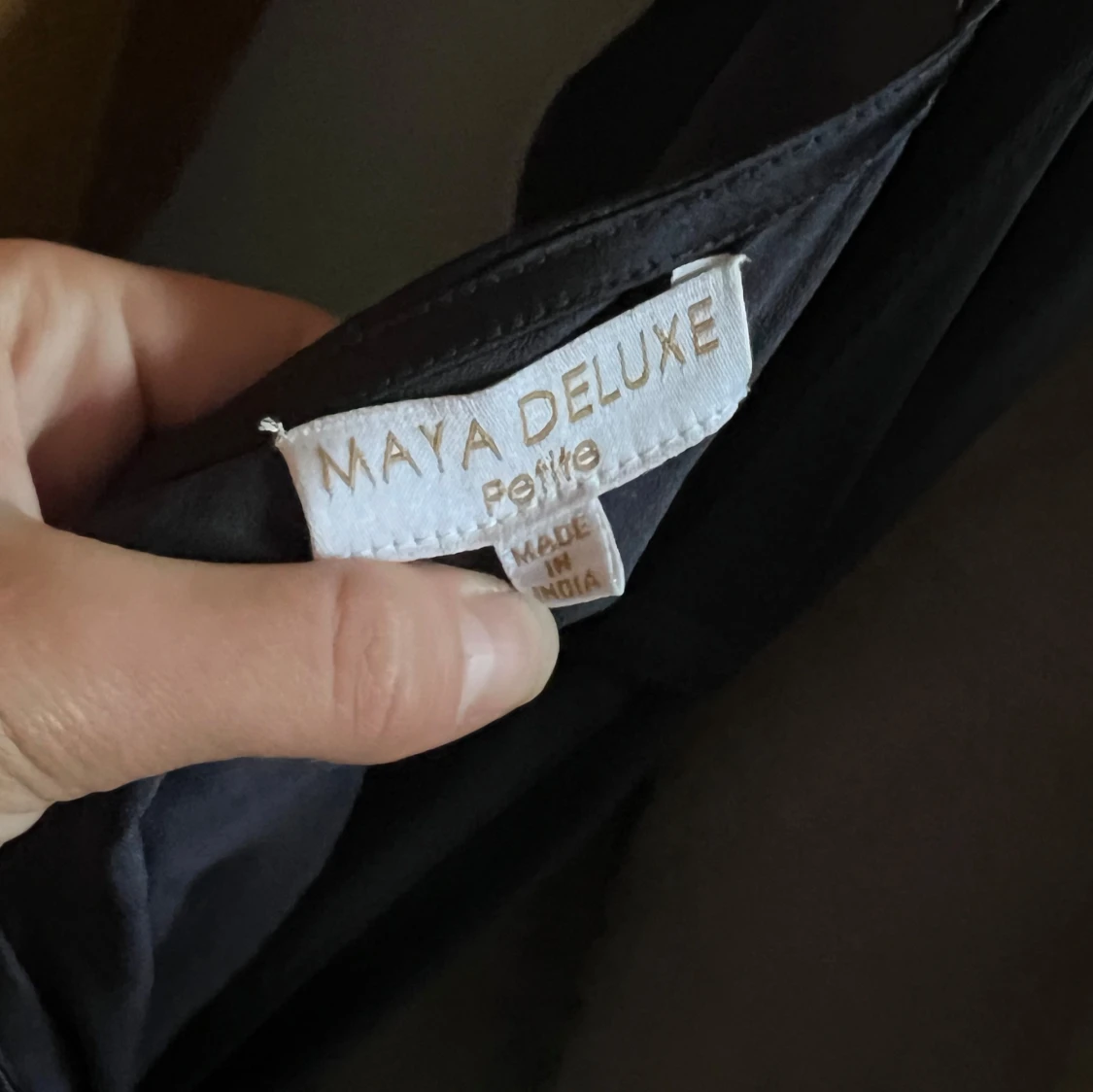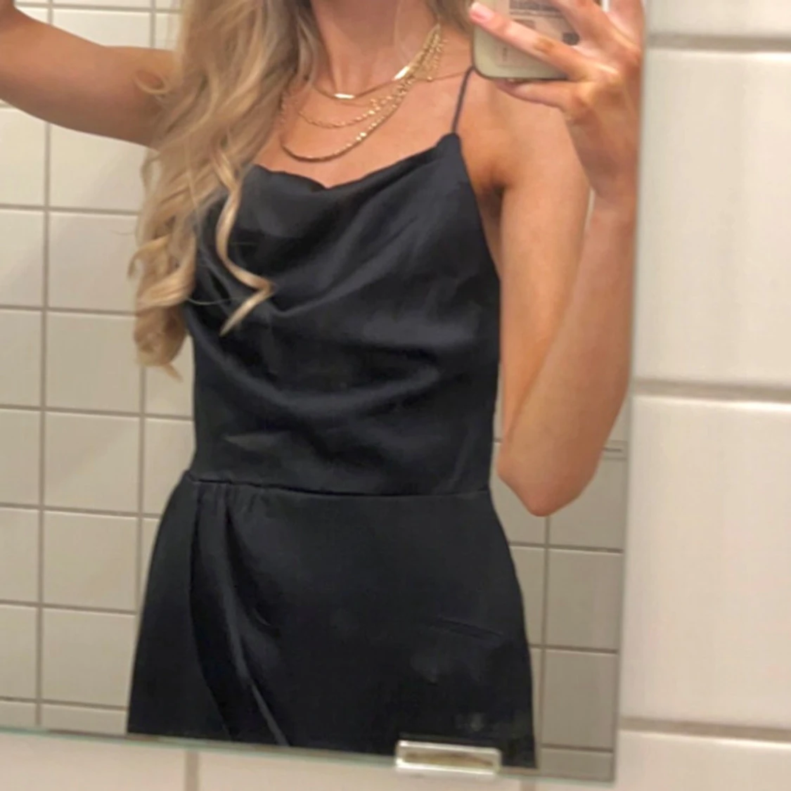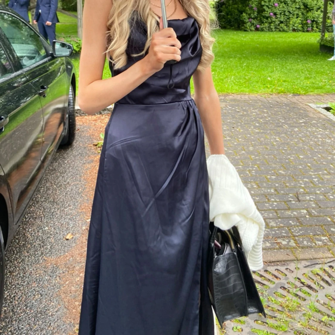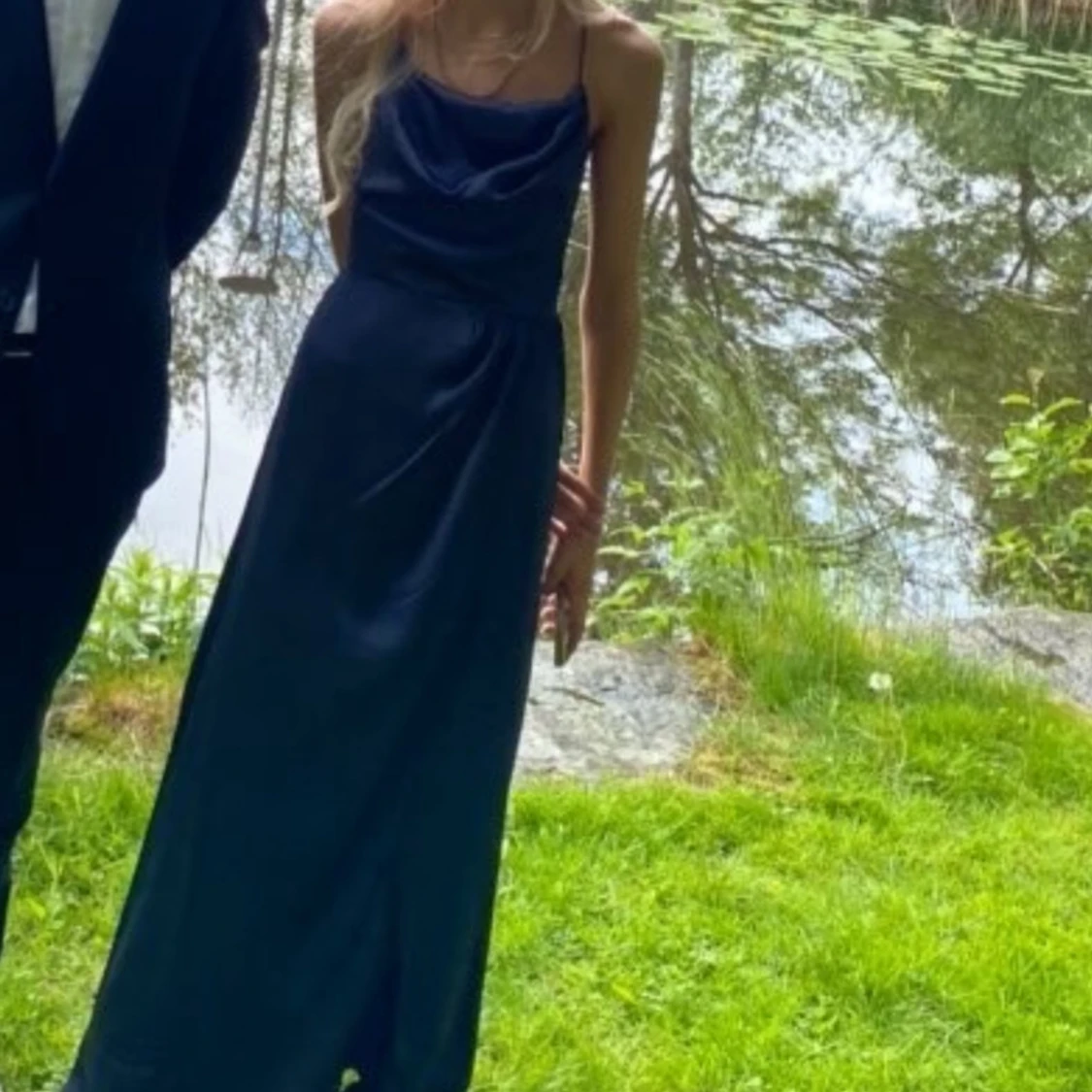Mörkblå maxiklänning i satin från maya deluxe med smala axelband. Är petite i storlek 32. Använd en gång!🫶